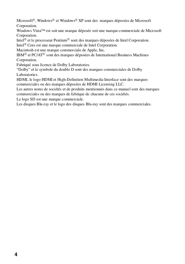 Microsoft® , Windows® et Windows® XP sont des marques déposées de Microsoft Corporation. Windows Vista™ est soit une marque déposée soit une marque commerciale de Microsoft Corporation. Intel ® et le processeur Pentium ® sont des marques déposées de Intel Corporation. Intel ® Core est une marque commerciale de Intel Corporation. Macintosh est une marque commerciale de Apple, Inc. IBM ® et PC/AT® sont des marques déposées de International Business Machines Corporation. Fabriqué sous licence de Dolby Laboratories. “Dolby” et le symbole du double D sont des marques commerciales de Dolby Laboratories. HDMI, le logo HDMI et High-Definition Multimedia Interface sont des marques commerciales ou des marques déposées de HDMI Licensing LLC. Les autres noms de sociétés et de produits mentionnés dans ce manuel sont des marques commerciales ou des marques de fabrique de chacune de ces sociétés. Le logo SD est une marque commerciale. Les disques Blu-ray et le logo des disques Blu-ray sont des marques commerciales.