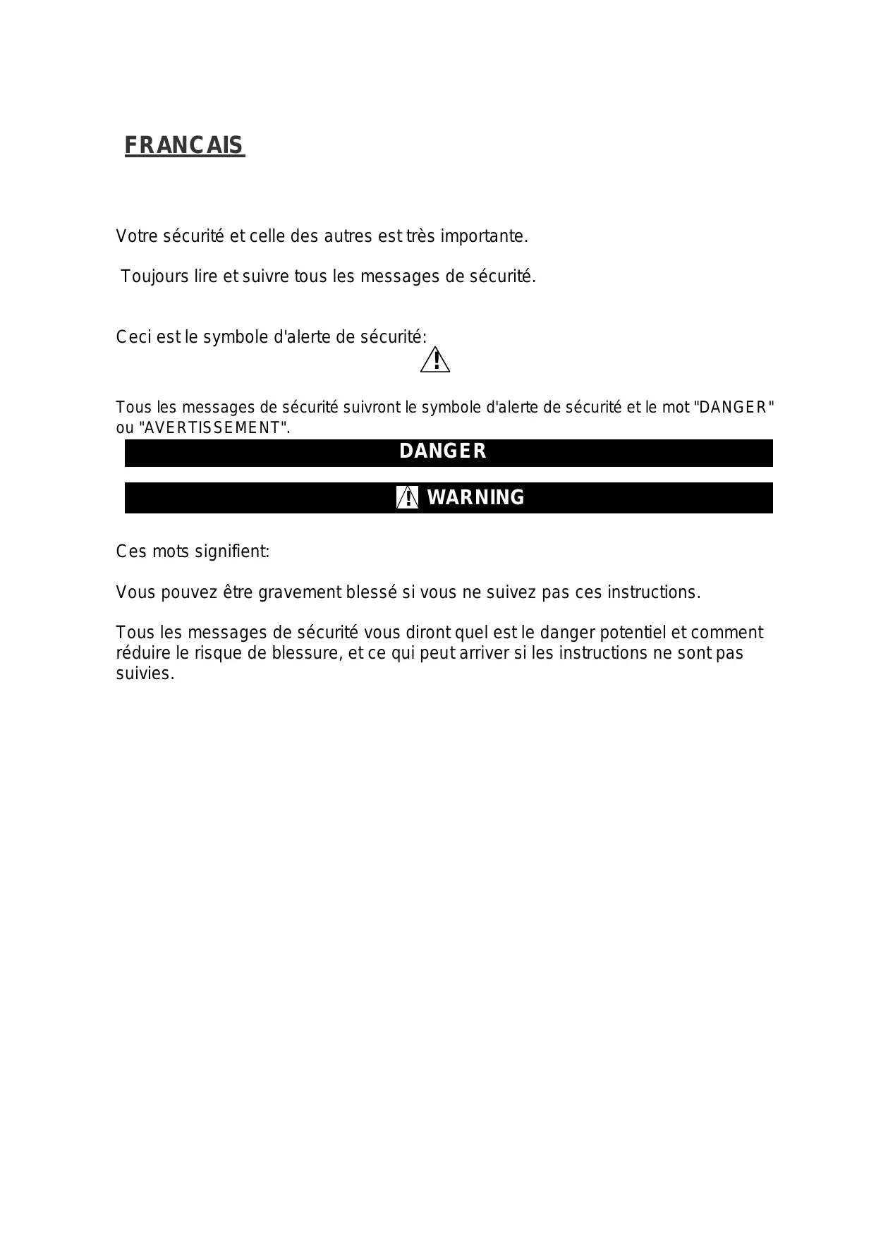 FRANCAIS Votre sécurité et celle des autres est très importante. Toujours lire et suivre tous les messages de sécurité. Ceci est le symbole d'alerte de sécurité: