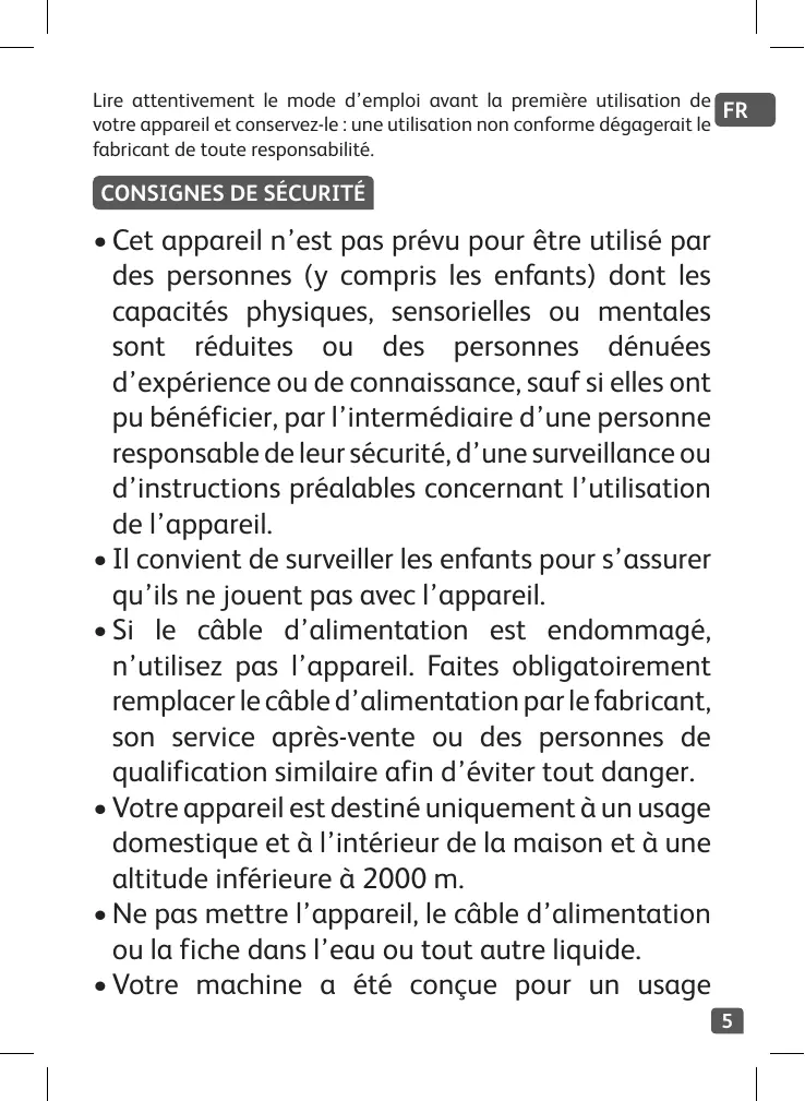 • Il convient de surveiller les enfants pour s’assurer qu’ils ne jouent pas avec l’appareil. • Si le câble d’alimentation est endommagé, n’utilisez pas l’appareil. Faites obligatoirement remplacer le câble d’alimentation par le fabricant, son service après-vente ou des personnes de qualification similaire afin d’éviter tout danger. • Votre appareil est destiné uniquement à un usage domestique et à l’intérieur de la maison et à une altitude inférieure à 2000 m. • Ne pas mettre l’appareil, le câble d’alimentation ou la fiche dans l’eau ou tout autre liquide. • Votre machine a été conçue pour un usage 5