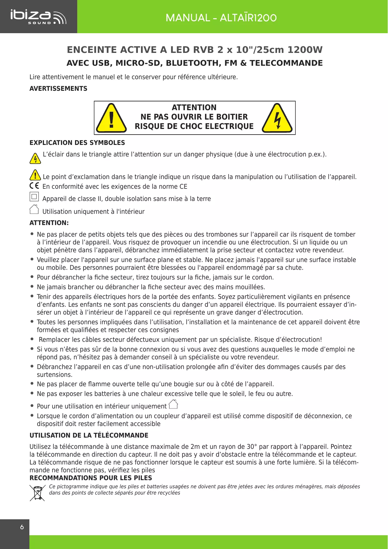 ENCEINTE ACTIVE A LED RVB 2 x 10"/25cm 1200W AVEC USB, MICRO-SD, BLUETOOTH, FM & TELECOMMANDE Lire attentivement le manuel et le conserver pour référence ultérieure.