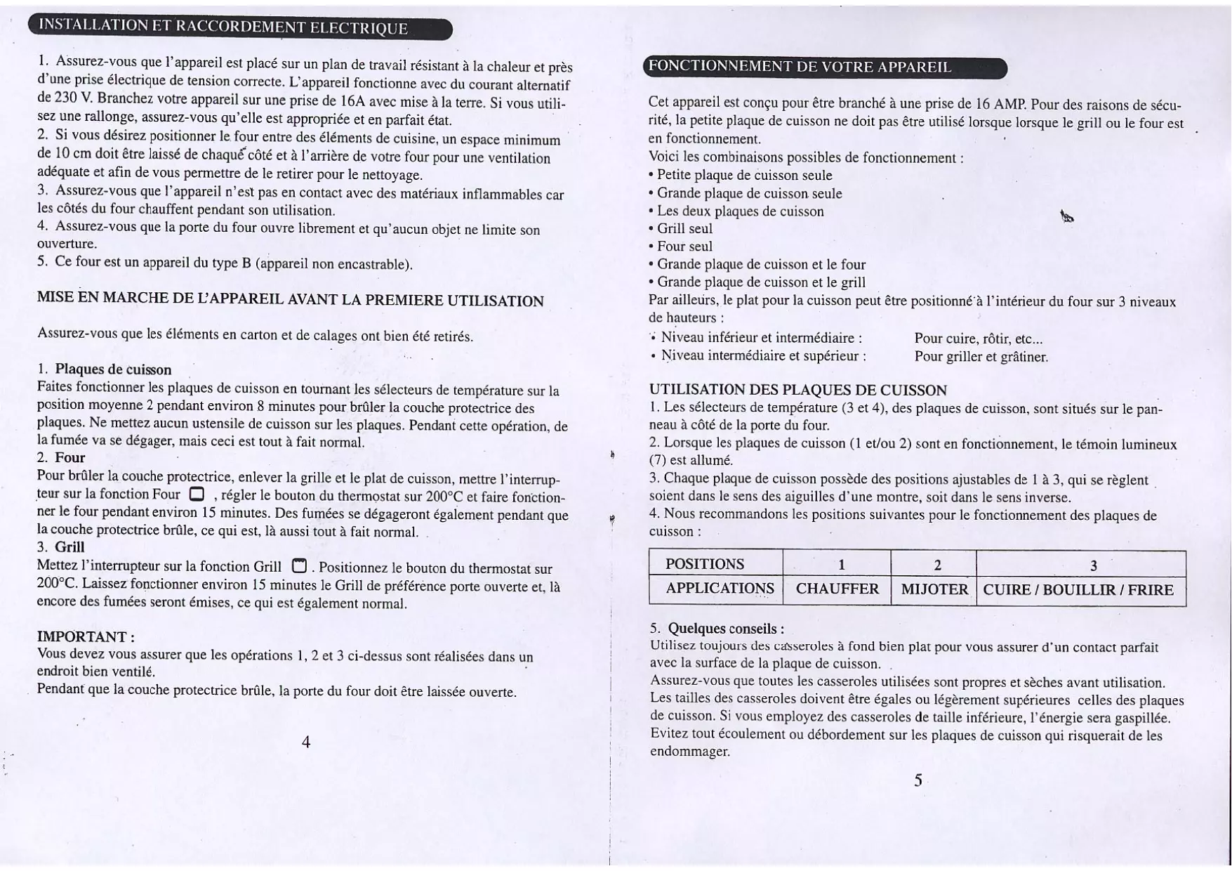 | Utilisation des plaques | Cuisson, friture, bouillir, mijoter |