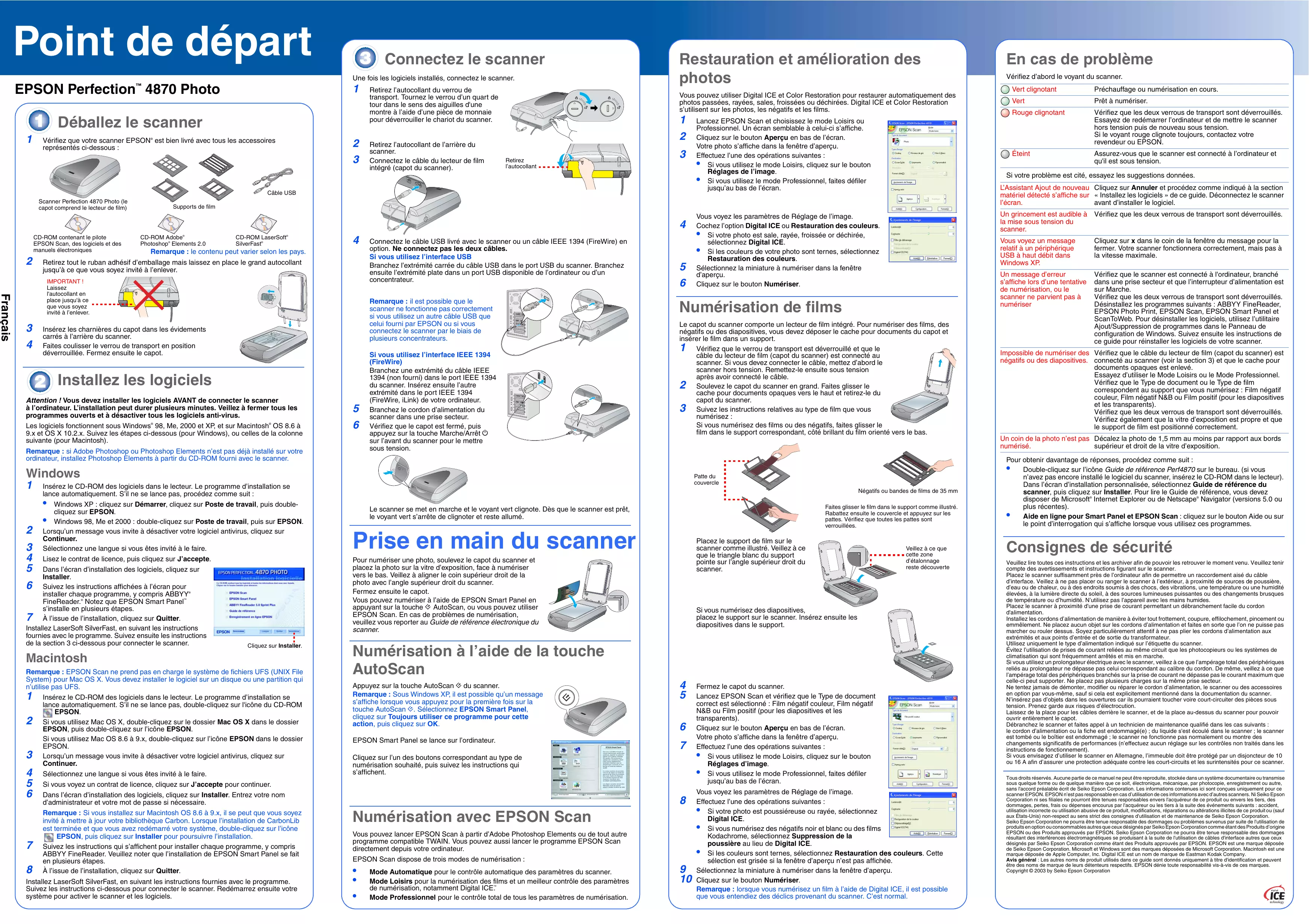 Cliquez sur l’un des boutons correspondant au type de numérisation souhaité, puis suivez les instructions qui s’affichent. Dans l’écran d’installation des logiciels, cliquez sur Installer. Entrez votre nom d’administrateur et votre mot de passe si nécessaire. Remarque : Si vous installez sur Macintosh OS 8.6 à 9.x, il se peut que vous soyez invité à mettre à jour votre bibliothèque Carbon. Lorsque l’installation de CarbonLib est terminée et que vous avez redémarré votre système, double-cliquez sur l’icône EPSON, puis cliquez sur Installer pour poursuivre l’installation. Suivez les instructions qui s’affichent pour installer chaque programme, y compris ABBYY FineReader. Veuillez noter que l’installation de EPSON Smart Panel se fait en plusieurs étapes. À l’issue de l’installation, cliquez sur Quitter. Vert Prêt à numériser. Rouge clignotant Vérifiez que les deux verrous de transport sont déverrouillés. Essayez de redémarrer l’ordinateur et de mettre le scanner hors tension puis de nouveau sous tension. Si le voyant rouge clignote toujours, contactez votre revendeur ou EPSON. Éteint Assurez-vous que le scanner est connecté à l’ordinateur et qu'il est sous tension. Vous voyez un message relatif à un périphérique USB à haut débit dans Windows XP. Cliquez sur x dans le coin de la fenêtre du message pour la fermer. Votre scanner fonctionnera correctement, mais pas à la vitesse maximale. Un message d’erreur s’affiche lors d’une tentative de numérisation, ou le scanner ne parvient pas à numériser Vérifiez que le scanner est connecté à l'ordinateur, branché dans une prise secteur et que l’interrupteur d’alimentation est sur Marche. Vérifiez que les deux verrous de transport sont déverrouillés. Désinstallez les programmes suivants : ABBYY FineReader, EPSON Photo Print, EPSON Scan, EPSON Smart Panel et ScanToWeb. Pour désinstaller les logiciels, utilisez l’utilitaire Ajout/Suppression de programmes dans le Panneau de configuration de Windows. Suivez ensuite les instructions de ce guide pour réinstaller les logiciels de votre scanner. Impossible de numériser des Vérifiez que le câble du lecteur de film (capot du scanner) est négatifs ou des diapositives. connecté au scanner (voir la section 3) et que le cache pour documents opaques est enlevé. Essayez d’utiliser le Mode Loisirs ou le Mode Professionnel. Vérifiez que le Type de document ou le Type de film correspondent au support que vous numérisez : Film négatif couleur, Film négatif N&B ou Film positif (pour les diapositives et les transparents). Vérifiez que les deux verrous de transport sont déverrouillés. Vérifiez également que la vitre d’exposition est propre et que le support de film est positionné correctement. Un coin de la photo n’est pas Décalez la photo de 1,5 mm au moins par rapport aux bords numérisé. supérieur et droit de la vitre d’exposition. Pour obtenir davantage de réponses, procédez comme suit :