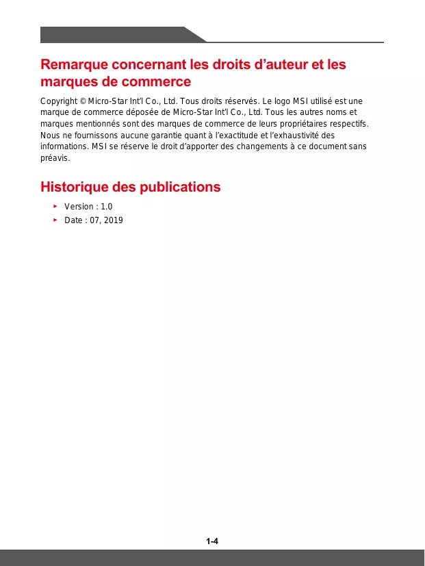 Copyright © Micro-Star Int'l Co., Ltd. Tous droits réservés. Le logo MSI utilisé est une marque de commerce déposée de Micro-Star Int'l Co., Ltd. Tous les autres noms et marques mentionnés sont des marques de commerce de leurs propriétaires respectifs. Nous ne fournissons aucune garantie quant à l'exactitude et l'exhaustivité des informations. MSI se réserve le droit d'apporter des changements à ce document sans préavis.