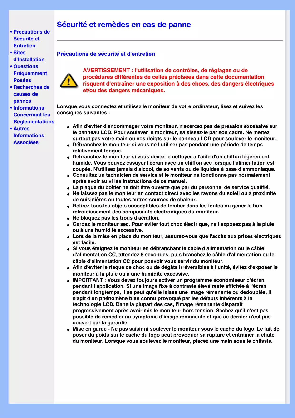 Sécurité et Entretien • Sites Précautions de sécurité et d'entretien d'Installation • Questions AVERTISSEMENT : l'utilisation de contrôles, de réglages ou de Fréquemment procédures différentes de celles précisées dans cette documentation Posées risquent d'entraîner une exposition à des chocs, des dangers électriques • Recherches de et/ou des dangers mécaniques. causes de pannes Lorsque vous connectez et utilisez le moniteur de votre ordinateur, lisez et suivez les • Informations Concernant les consignes suivantes : Réglementations ● Afin d'éviter d'endommager votre moniteur, n'exercez pas de pression excessive sur • Autres le panneau LCD. Pour soulever le moniteur, saisissez-le par son cadre. Ne mettez Informations surtout pas votre main ou vos doigts sur le panneau LCD pour soulever le moniteur. Associées ● Débranchez le moniteur si vous ne l'utiliser pas pendant une période de temps relativement longue. ● Débranchez le moniteur si vous devez le nettoyer à l'aide d'un chiffon légèrement humide. Vous pouvez essuyer l'écran avec un chiffon sec lorsque l'alimentation est coupée. N'utilisez jamais d'alcool, de solvants ou de liquides à base d'ammoniaque. ● Consultez un technicien de service si le moniteur ne fonctionne pas normalement après avoir suivi les instructions de ce manuel. ● La plaque du boîtier ne doit être ouverte que par du personnel de service qualifié. ● Ne laissez pas le moniteur en contact direct avec les rayons du soleil ou à proximité de cuisinières ou toutes autres sources de chaleur. ● Retirez tous les objets susceptibles de tomber dans les fentes ou gêner le bon refroidissement des composants électroniques du moniteur. ● Ne bloquez pas les trous d'aération. ● Gardez le moniteur sec. Pour éviter tout choc électrique, ne l'exposez pas à la pluie ou à une humidité excessive. ● Lors de la mise en place du moniteur, assurez-vous que l'accès aux prises électriques est facile. ● Si vous éteignez le moniteur en débranchant le câble d'alimentation ou le câble d'alimentation CC, attendez 6 secondes, puis branchez le câble d'alimentation ou le câble d'alimentation CC pour pouvoir vous servir du moniteur. ● Afin d'éviter le risque de choc ou de dégâts irréversibles à l'unité, évitez d'exposer le moniteur à la pluie ou à une humidité excessive. ● IMPORTANT : Vous devez toujours activer un programme économiseur d'écran pendant l'application. Si une image fixe à contraste élevé reste affichée à l'écran pendant longtemps, il se peut qu'elle laisse une image rémanente ou dédoublée. Il s'agit d'un phénomène bien connu provoqué par les défauts inhérents à la technologie LCD. Dans la plupart des cas, l'image rémanente disparaît progressivement après avoir mis le moniteur hors tension. Sachez qu'il n'est pas possible de remédier au symptôme d'image rémanente et que ce dernier n'est pas couvert par la garantie. ● Mise en garde - Ne pas saisir ni soulever le moniteur sous le cache du logo. Le fait de poser du poids sur le cache du logo peut provoquer sa rupture et entraîner la chute du moniteur. Lorsque vous soulevez le moniteur, placez une main sous le châssis.