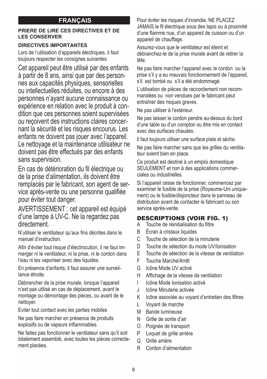 DESCRIPTIONS (VOIR FIG. 1) A Touche de réinitialisation du filtre B Écran à cristaux liquides C Touche de sélection de la minuterie D Touche de sélection du mode UV/Ionisation E Touche de sélection de la vitesse de ventilation F Touche Marche/Arrêt G Icône Mode UV activé H Affichage de la vitesse de ventilation I Icône Mode Ionisation activé J Icône Minuterie activée K Icône associée au voyant d’entretien des filtres L Voyant de marche M Bande lumineuse N Grille de sortie d’air O Poignée de transport P Loquet de grille arrière Q Grille arrière R Cordon d’alimentation