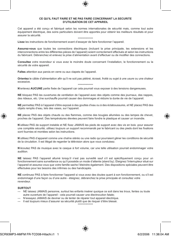 Conservez ce guide d’utilisation pour référence ultérieure. Si vous n’entendez aucun son dans les haut-parleurs lorsque vous augmentez le volume, baissez le volume, basculez le bouton STANDBY/ON (VEILLE/MARCHE) en position STANDBY (VEILLE) et vérifiez que les fils des haut-parleurs sont correctement branchés. Votre lecteur intègre un circuit silencieux et requiert de 2 à 4 secondes avant d’atteindre un régime stable après un changement STANDBY/ON (VEILLE/MARCHE). N’ouvrez jamais le boîtier de votre lecteur, ni ne touchez quoi que ce soit à l’intérieur, ni d’introduisez des objets en métal à l’intérieur, afin d’éviter tout risque d’électrocution ou de court-circuit. Dès que vous entendez le tonnerre, débranchez immédiatement le cordon d’alimentation de la prise secteur et débranchez également l’antenne. Ne placez pas votre lecteur dans un endroit où il risque de tomber dans de l’eau ou de recevoir de l’eau. Pour enlever la poussière déposée sur les surfaces extérieures de votre lecteur, utilisez un chiffon sec. N’employez jamais de diluant, d’essence ou d’alcool pour ne pas abîmer la finition extérieure. Protégez votre lecteur contre tout excès de chaleur (par exemple les rayons directs du soleil ou un appareil de chauffage), poussière et humidité. Votre lecteur de CD reconnaît tous les disques portant l’estampille Compact Disc Digital Audio. Faites attention à ne pas endommager le cordon d’alimentation. Pour le débrancher de la prise secteur, saisissez-le par sa prise ; ne tirez jamais le cordon même. N’installez pas votre lecteur dans un espace restreint mal aéré : il risque de surchauffer et de ne plus fonctionner correctement. N’introduisez aucun objet dans le compartiment de disque, vous risquez d’endommager le mécan isme d’entraînement et de fermeture. Ne déplacez pas votre lecteur d’un endroit très chaud à un endroit très froid, et vice versa. Le changement brusque de température peut provoquer la formation de vapeur de condensation sur la lentille de lecture, empêchant par cela le bon fonctionnement de votre appareil. Si vous remarquez la présence de gouttes de condensation sur votre lecteur, attendez 1 à 2 heures avant de l’allumer. Si vous entendez un bruit pendant la lecture d’un CD après que votre lecteur ait subi un choc ou une secousse, ne vous en inquiétez pas. Ce bruit est normal. La dynamique de votre lecteur de CD est importante. Aussi, n’augmentez pas de trop le volume à l’écoute d’un passage faible (bas niveau sonore) car vous risquez d’endommager vos haut-parleurs, n’étant pas conçus pour encaisser les grandes dynamiques soudaines. Ne rangez pas vos disques dans un endroit excessivement chaud ou humide. Les hautes températures risquent de déformer la surface des disques qui ne seront alors plus lisibles. Une humidité excessive peut également rendre vos disques illisibles. Essuyez les traces d’humidité avec un chiffon doux et sec, et n’insérez aucun disque dans l’appareil s’il n’est pas complètement sec. Ne laissez pas un disque à l’intérieur de votre lecteur de CD si vous n’envisagez pas d’utiliser votre appareil avant longtemps. Votre appareil n’a pas été conçu pour lire les CD de forme spéciale (en forme de coeur, octogonale, etc.). Si vous introduisez un tel CD dans le compartiment de disque de votre lecteur, vous risquez d’endommager votre appareil. N’utilisez pas de tels CD. PROTECTION L’énergie électrique permet d’exécuter de nombreuses fonctions utiles. Votre appareil a été conçu et fabriqué pour vous assurer une sécurité maximale. Cependant, une mauvaise utilisation ou manipulation peut vous exposer à un risque d’électrocution ou provoquer un début d’incendie. Pour vous prévenir de ces dangers, respectez toutes les instructions d’installation, d’utilisation et d’entretien portées dans ce guide. SCR93MP3-AMFM FR-TCD08-Hitachi.i3 3 6/2/2006 11:38:05 AM CONTRÔLES