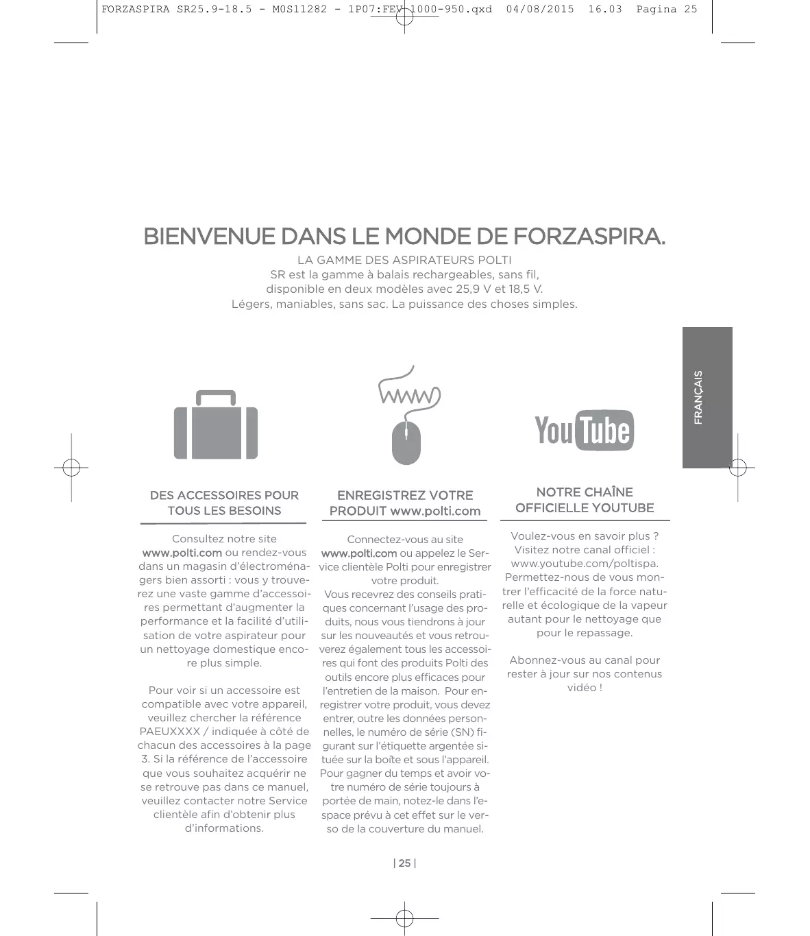 OFFICIELLE YOUTUBE Voulez-vous en savoir plus ? Connectez-vous au site Visitez notre canal officiel : www.polti.com ou appelez le Serwww.youtube.com/poltispa. vice clientèle Polti pour enregistrer Permettez-nous de vous monvotre produit. Vous recevrez des conseils prati- trer l’efficacité de la force natuques concernant l’usage des pro- relle et écologique de la vapeur autant pour le nettoyage que duits, nous vous tiendrons à jour pour le repassage. sur les nouveautés et vous retrouverez également tous les accessoiAbonnez-vous au canal pour res qui font des produits Polti des rester à jour sur nos contenus outils encore plus efficaces pour vidéo ! Pour voir si un accessoire est l’entretien de la maison. Pour encompatible avec votre appareil, registrer votre produit, vous devez veuillez chercher la référence entrer, outre les données personPAEUXXXX / indiquée à côté de nelles, le numéro de série (SN) fichacun des accessoires à la page gurant sur l’étiquette argentée si3. Si la référence de l’accessoire tuée sur la boîte et sous l’appareil. que vous souhaitez acquérir ne Pour gagner du temps et avoir vose retrouve pas dans ce manuel, tre numéro de série toujours à veuillez contacter notre Service portée de main, notez-le dans l’eclientèle afin d’obtenir plus space prévu à cet effet sur le verd’informations. so de la couverture du manuel. Consultez notre site www.polti.com ou rendez-vous dans un magasin d’électroménagers bien assorti : vous y trouverez une vaste gamme d’accessoires permettant d’augmenter la performance et la facilité d’utilisation de votre aspirateur pour un nettoyage domestique encore plus simple. | 25 | FORZASPIRA SR25.9-18.5 - M0S11282 - 1P07:FEV 1000-950.qxd 04/08/2015