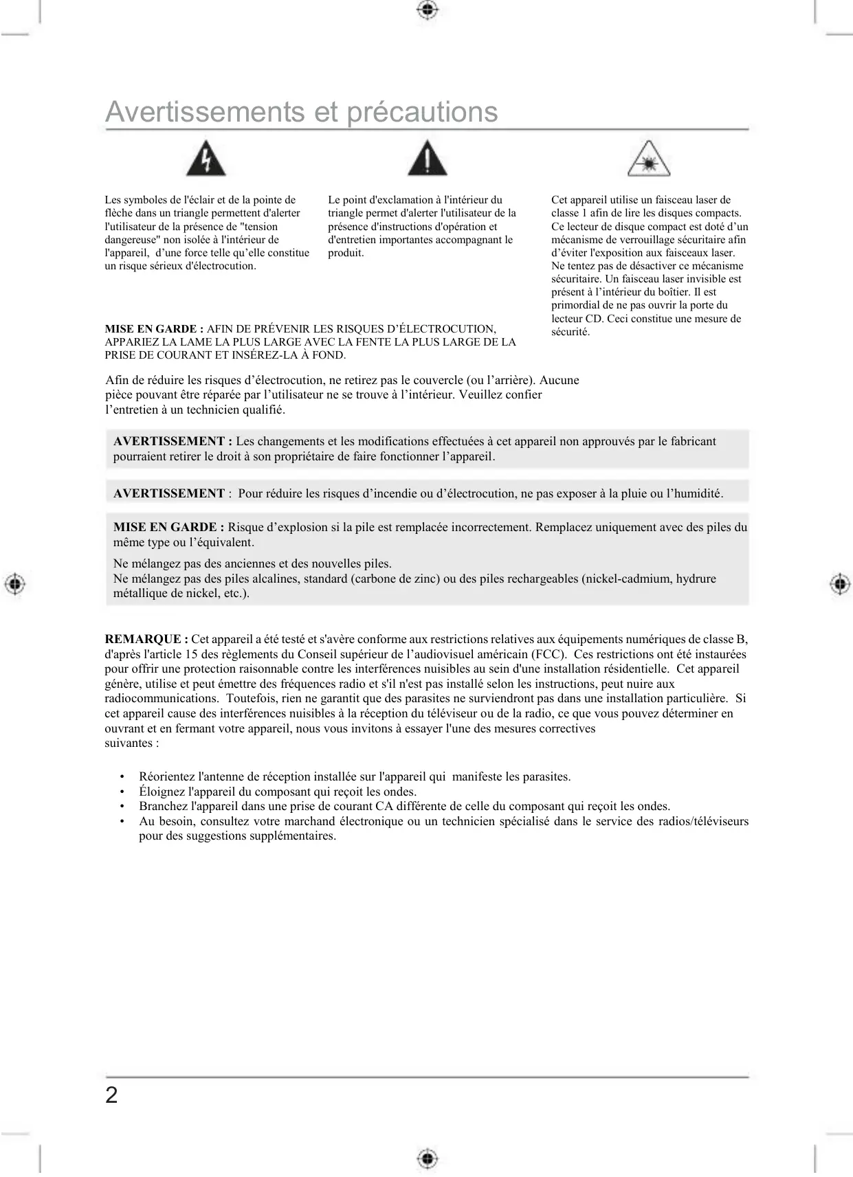 Avertissements et précautions 2 Mesures de sécurité importantes 3 Caractéristiques 4 Mise en fonction 4 Dans la boîte 4 Syntonisation d'une station AM ou FM 5 Lecture d'un CD 5 Programmation d'un CD 5 Utiliser l'entrée auxiliaire 5 Emplacement des commandes 6 Définitions et commandes 7 Carte de garantie 8