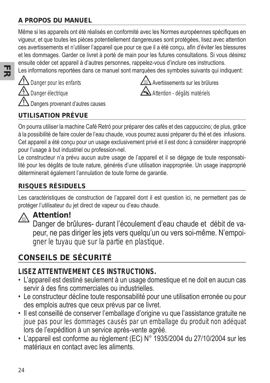 Même si les appareils ont été réalisés en conformité avec les Normes européennes spécifiques en vigueur, et que toutes les pièces potentiellement dangereuses sont protégées, lisez avec attention ces avertissements et n’utiliser l’appareil que pour ce que il a été conçu, afin d’éviter les blessures et les dommages. Garder ce livret à porté de main pour les futures consultations. Si vous désirez ensuite céder cet appareil à d’autres personnes, rappelez-vous d’inclure ces instructions. Les informations reportées dans ce manuel sont marquées des symboles suivants qui indiquent: Danger pour les enfants Avertissements sur les brûlures Danger électrique Attention - dégâts matériels Dangers provenant d’autres causes