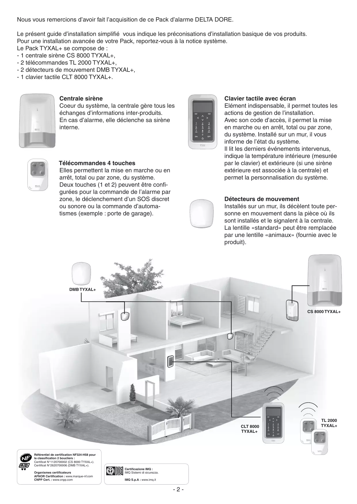 Pack TYXAL+ www.deltadore.com Guide d’installation simplifié Nous vous remercions d’avoir fait l’acquisition de ce Pack d’alarme DELTA DORE. Le présent guide d’installation simplifié vous indique les préconisations d’installation basique de vos produits. Pour une installation avancée de votre Pack, reportez-vous à la notice système. Le Pack TYXAL+ se compose de : - 1 centrale sirène CS 8000 TYXAL+, - 2 télécommandes TL 2000 TYXAL+, - 2 détecteurs de mouvement DMB TYXAL+, - 1 clavier tactile CLT 8000 TYXAL+. Centrale sirène Coeur du système, la centrale gère tous les échanges d’informations inter-produits. En cas d’alarme, elle déclenche sa sirène interne. Télécommandes 4 touches Elles permettent la mise en marche ou en arrêt, total ou par zone, du système. Deux touches (1 et 2) peuvent être configurées pour la commande de l’alarme par zone, le déclenchement d’un SOS discret ou sonore ou la commande d’automatismes (exemple : porte de garage). Clavier tactile avec écran Elément indispensable, il permet toutes les actions de gestion de l’installation. Avec son code d’accès, il permet la mise en marche ou en arrêt, total ou par zone, du système. Installé sur un mur, il vous informe de l’état du système. Il lit les derniers événements intervenus, indique la température intérieure (mesurée par le clavier) et extérieure (si une sirène extérieure est associée à la centrale) et permet la personnalisation du système. Détecteurs de mouvement Installés sur un mur, ils décèlent toute personne en mouvement dans la pièce où ils sont installés et le signalent à la centrale. La lentille «standard» peut être remplacée par une lentille «animaux» (fournie avec le produit). DMB TYXAL+ CS 8000 TYXAL+ CLT 8000 TYXAL+ Référentiel de certification NF324-H58 pour la classification 2 boucliers : Certificat N°1120700002 (CS 8000 TYXAL+). Certificat N°2620700006 (DMB TYXAL+). Organismes certificateurs AFNOR Certification : www.marque-nf.com CNPP Cert. : www.cnpp.com Certificazione IMQ : IMQ Sistemi di sicurezza. IMQ S.p.A : www.imq.it