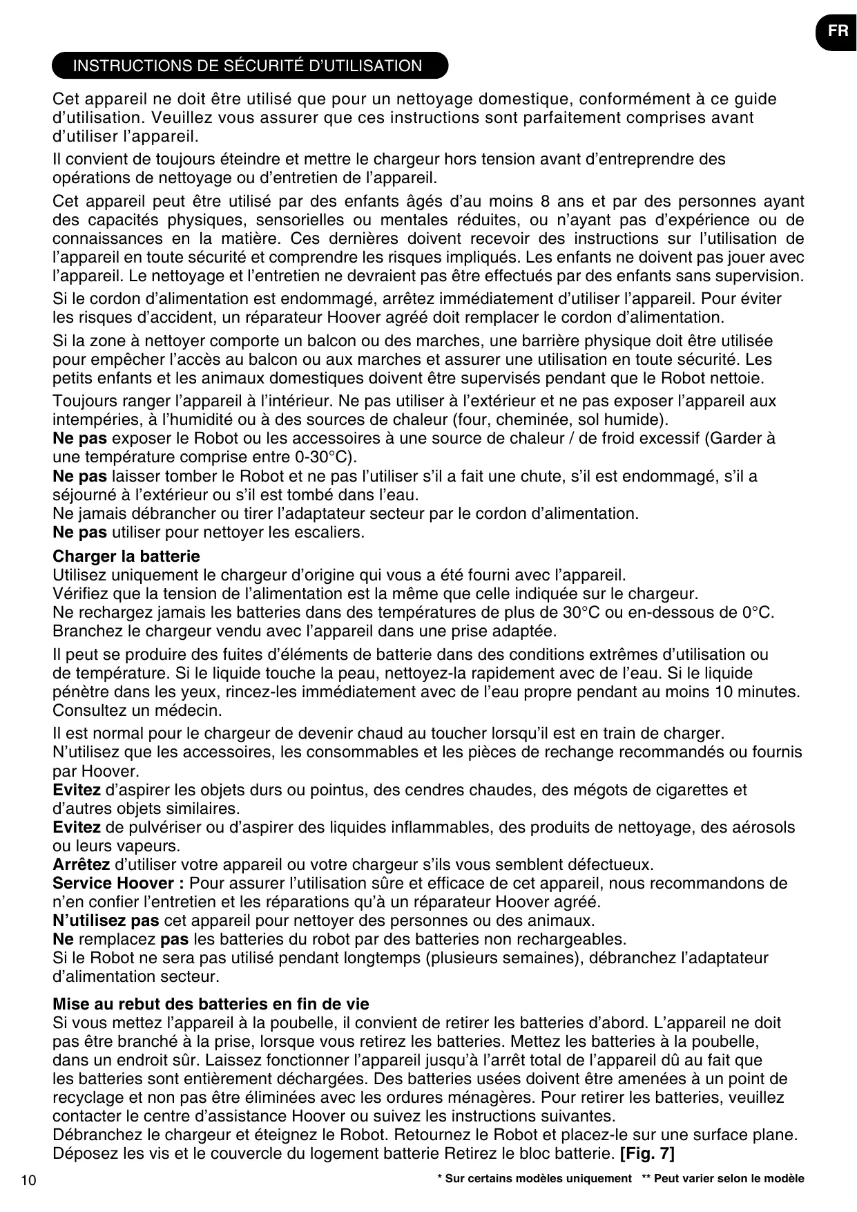 Cet appareil ne doit être utilisé que pour un nettoyage domestique, conformément à ce guide d’utilisation. Veuillez vous assurer que ces instructions sont parfaitement comprises avant d’utiliser l’appareil. Il convient de toujours éteindre et mettre le chargeur hors tension avant d’entreprendre des opérations de nettoyage ou d’entretien de l’appareil. Cet appareil peut être utilisé par des enfants âgés d’au moins 8 ans et par des personnes ayant des capacités physiques, sensorielles ou mentales réduites, ou n’ayant pas d’expérience ou de connaissances en la matière. Ces dernières doivent recevoir des instructions sur l’utilisation de l’appareil en toute sécurité et comprendre les risques impliqués. Les enfants ne doivent pas jouer avec l’appareil. Le nettoyage et l’entretien ne devraient pas être effectués par des enfants sans supervision. Si le cordon d’alimentation est endommagé, arrêtez immédiatement d’utiliser l’appareil. Pour éviter les risques d’accident, un réparateur Hoover agréé doit remplacer le cordon d’alimentation. Si la zone à nettoyer comporte un balcon ou des marches, une barrière physique doit être utilisée pour empêcher l’accès au balcon ou aux marches et assurer une utilisation en toute sécurité. Les petits enfants et les animaux domestiques doivent être supervisés pendant que le Robot nettoie. Toujours ranger l’appareil à l’intérieur. Ne pas utiliser à l’extérieur et ne pas exposer l’appareil aux intempéries, à l’humidité ou à des sources de chaleur (four, cheminée, sol humide). Ne pas exposer le Robot ou les accessoires à une source de chaleur / de froid excessif (Garder à une température comprise entre 0-30°C). Ne pas laisser tomber le Robot et ne pas l’utiliser s’il a fait une chute, s’il est endommagé, s’il a séjourné à l’extérieur ou s’il est tombé dans l’eau. Ne jamais débrancher ou tirer l’adaptateur secteur par le cordon d’alimentation. Ne pas utiliser pour nettoyer les escaliers. Charger la batterie Utilisez uniquement le chargeur d’origine qui vous a été fourni avec l’appareil. Vérifiez que la tension de l’alimentation est la même que celle indiquée sur le chargeur. Ne rechargez jamais les batteries dans des températures de plus de 30°C ou en-dessous de 0°C. Branchez le chargeur vendu avec l’appareil dans une prise adaptée. Il peut se produire des fuites d’éléments de batterie dans des conditions extrêmes d’utilisation ou de température. Si le liquide touche la peau, nettoyez-la rapidement avec de l’eau. Si le liquide pénètre dans les yeux, rincez-les immédiatement avec de l’eau propre pendant au moins 10 minutes. Consultez un médecin. Il est normal pour le chargeur de devenir chaud au toucher lorsqu’il est en train de charger. N’utilisez que les accessoires, les consommables et les pièces de rechange recommandés ou fournis par Hoover. Evitez d’aspirer les objets durs ou pointus, des cendres chaudes, des mégots de cigarettes et d’autres objets similaires. Evitez de pulvériser ou d’aspirer des liquides inflammables, des produits de nettoyage, des aérosols ou leurs vapeurs. Arrêtez d’utiliser votre appareil ou votre chargeur s’ils vous semblent défectueux. Service Hoover : Pour assurer l’utilisation sûre et efficace de cet appareil, nous recommandons de n’en confier l’entretien et les réparations qu’à un réparateur Hoover agréé. N’utilisez pas cet appareil pour nettoyer des personnes ou des animaux. Ne remplacez pas les batteries du robot par des batteries non rechargeables. Si le Robot ne sera pas utilisé pendant longtemps (plusieurs semaines), débranchez l’adaptateur d’alimentation secteur. Mise au rebut des batteries en fin de vie Si vous mettez l’appareil à la poubelle, il convient de retirer les batteries d’abord. L’appareil ne doit pas être branché à la prise, lorsque vous retirez les batteries. Mettez les batteries à la poubelle, dans un endroit sûr. Laissez fonctionner l’appareil jusqu’à l’arrêt total de l’appareil dû au fait que les batteries sont entièrement déchargées. Des batteries usées doivent être amenées à un point de recyclage et non pas être éliminées avec les ordures ménagères. Pour retirer les batteries, veuillez contacter le centre d’assistance Hoover ou suivez les instructions suivantes. Débranchez le chargeur et éteignez le Robot. Retournez le Robot et placez-le sur une surface plane. Déposez les vis et le couvercle du logement batterie Retirez le bloc batterie. [Fig. 7]