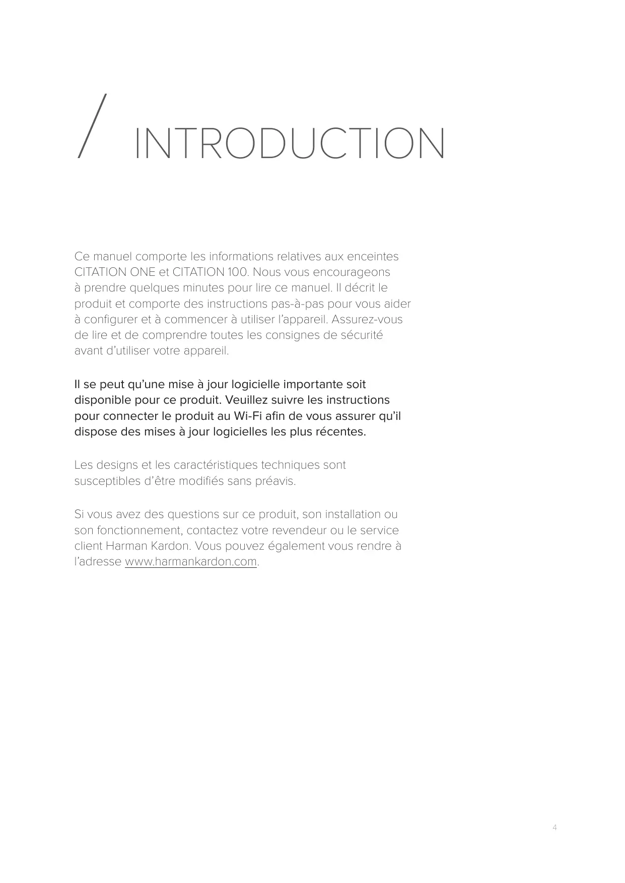 / INTRODUCTION Ce manuel comporte les informations relatives aux enceintes CITATION ONE et CITATION 100. Nous vous encourageons à prendre quelques minutes pour lire ce manuel. Il décrit le produit et comporte des instructions pas-à-pas pour vous aider à configurer et à commencer à utiliser l’appareil. Assurez-vous de lire et de comprendre toutes les consignes de sécurité avant d’utiliser votre appareil. Il se peut qu’une mise à jour logicielle importante soit disponible pour ce produit. Veuillez suivre les instructions pour connecter le produit au Wi-Fi afin de vous assurer qu’il dispose des mises à jour logicielles les plus récentes. Les designs et les caractéristiques techniques sont susceptibles d’être modifiés sans préavis. Si vous avez des questions sur ce produit, son installation ou son fonctionnement, contactez votre revendeur ou le service client Harman Kardon. Vous pouvez également vous rendre à l’adresse www.harmankardon.com.