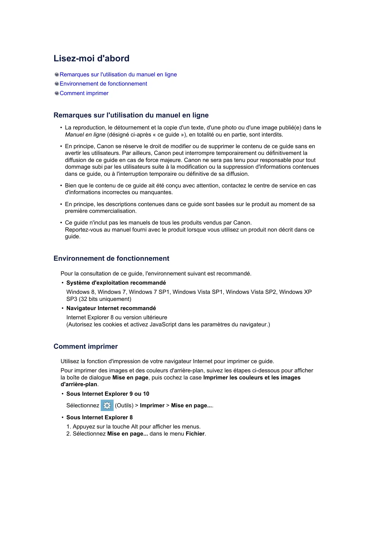 MX920 series Manuel en ligne Lisez-moi d'abord Fonctions utiles disponibles sur la machine Présentation de la machine Français (French) Lisez-moi d'abord Remarques sur l'utilisation du manuel en ligne Environnement de fonctionnement Comment imprimer Remarques sur l'utilisation du manuel en ligne