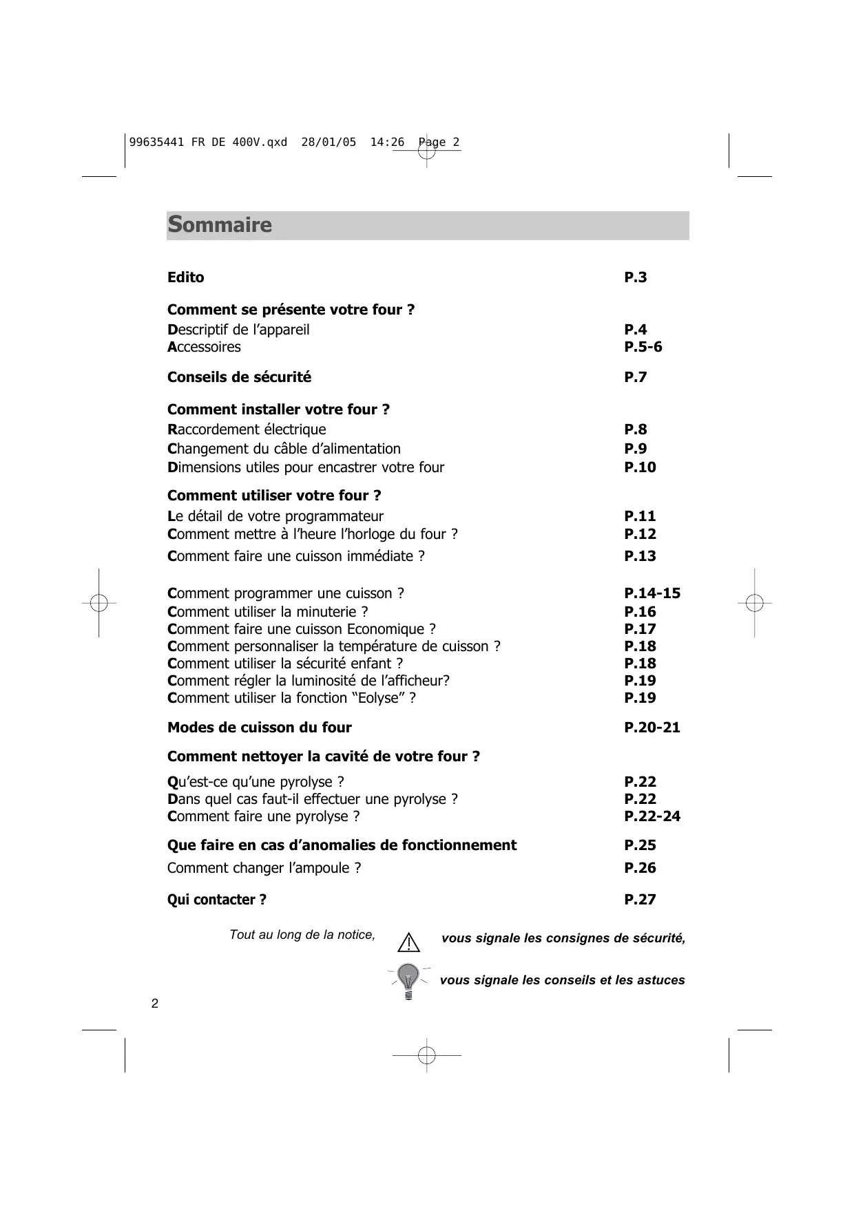P.22 vous signale les consignes de sécurité, vous signale les conseils et les astuces