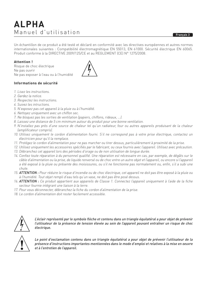 Ne pas ouvrir Ne pas exposer à l’eau ou à l’humidité Informations de sécurité 1. Lisez les instructions. 2. Gardez la notice. 3. Respectez les instructions. 4. Suivez les intructions. 5. N’exposez pas cet appareil à la pluie ou à l’humidité. 6. Nettoyez uniquement avec un chiffon sec. 7. Ne bloquez pas les sorties de ventilation (papiers, chiffons, rideaux, ...). 8. Laissez une distance de 5 cm minimum autour du produit pour une bonne ventilation. 9. N’installez pas près d’une source de chaleur tel qu’un radiateur, four ou autres appareils produisant de la chaleur (amplificateur compris). 10. Utilisez uniquement le cordon d’alimentation fourni. S’il ne correspond pas à votre prise électrique, contactez un électricien pour qu’il la remplace. 11. Protégez le cordon d’alimentation pour ne pas marcher ou tirer dessus, particulièrement à proximité de la prise. 12.Utilisez uniquement les accessoires spécifiés par le fabricant, ou ceux fournis avec l’appareil. Utilisez avec précaution. 13. Débranchez cet appareil lors des périodes d’orage ou de non utilisation de longue durée. 14. Confiez toute réparation à du personnel qualifié. Une réparation est nécessaire en cas, par exemple, de dégâts sur le câble d’alimentation ou la prise, de liquide renversé ou de choc entre un autre objet et l’appareil, ou encore si l’appareil a été exposé à la pluie ou présente des moisissures, ou s’il ne fonctionne pas normalement ou, enfin, s’il a subi une chute. 15. ATTENTION : Pour réduire le risque d’incendie ou de choc électrique, cet appareil ne doit pas être exposé à la pluie ou à l’humidité. Tout objet rempli d’eau tels qu’un vase, ne doit pas être posé dessus. 16. ATTENTION : Ce produit appartient aux appareils de Classe 1. Connectez l’appareil uniquement à l’aide de la fiche secteur fournie intégrant une liaison à la terre. 17. Pour vous déconnecter, débranchez la fiche du cordon d’alimentation de la prise. 18. Le cordon d’alimentation doit rester facilement accessible.