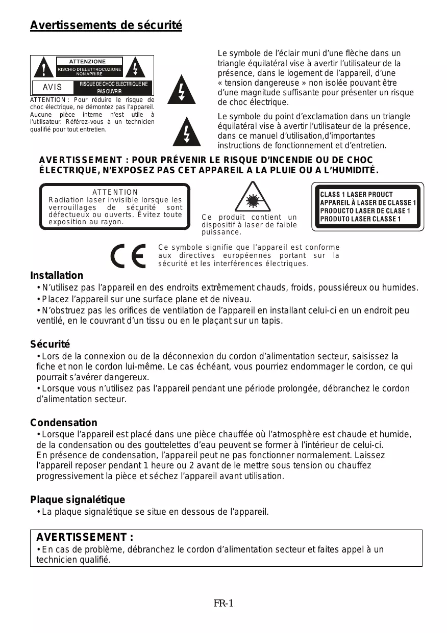 ATTENTION: Pour réduire le risque de choc électrique, ne démontez pas l'appareil. Aucune pièce interne n'est utile à l'utilisateur. Référez-vous à un technicien qualifié pour tout entretien.
