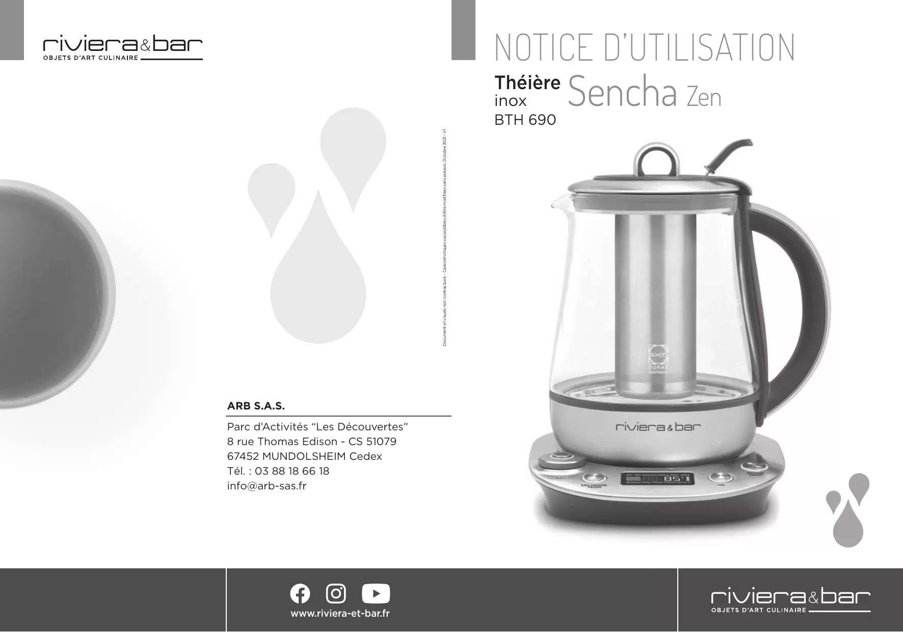 notice d’utilisation Théière inox Document et visuels non contractuels - Caractéristiques susceptibles d’être modifiées sans préavis. Octobre 2021 - V1 BTH 690 ARB S.A.S. Parc d’Activités “Les Découvertes” 8 rue Thomas Edison - CS 51079 67452 Mundolsheim Cedex Tél. : 03 88 18 66 18 info@arb-sas.fr www.riviera-et-bar.fr Sencha Zen sommaire Avec cet appareil, vous avez fait l’acquisition d’un article de qualité, bénéficiant de toute l’expérience de Riviera-et-Bar dans le domaine de la préparation de boissons. Il répond aux critères de qualité Riviera-et-Bar : les meilleurs matériaux et composants ont été utilisés pour sa fabrication, et il a été soumis à des contrôles rigoureux. Nous souhaitons que son usage vous apporte entière satisfaction.