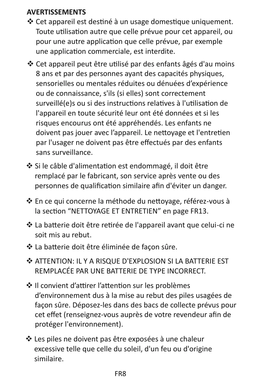 Cet appareil est destiné à un usage domestique uniquement. Toute utilisation autre que celle prévue pour cet appareil, ou pour une autre application que celle prévue, par exemple une application commerciale, est interdite. Cet appareil peut être utilisé par des enfants âgés d'au moins 8 ans et par des personnes ayant des capacités physiques, sensorielles ou mentales réduites ou dénuées d'expérience ou de connaissance, s'ils (si elles) sont correctement surveillés ou si des instructions relatives à l'utilisation de l'appareil en toute sécurité leur ont été données et si les risques encourus ont été appréhendés. Les enfants ne doivent pas jouer avec l'appareil. Le nettoyage et l'entretien par l'usager ne doivent pas être effectués par des enfants sans surveillance. Si le câble d'alimentation est endommagé, il doit être remplacé par le fabricant, son service après-vente ou des personnes de qualification similaire afin d'éviter un danger. En ce qui concerne la méthode du nettoyage, réferez-vous à la section “NETTOYAGE ET ENTRETIEN” en page FR13. La batterie doit être retirée de l'appareil avant que celui-ci ne soit mis au rebut. La batterie doit être éliminée de façon sûre. ATTENTION: IL Y A RISQUE D'EXPLOSION SI LA BATTERIE EST REMPLACÉE PAR UNE BATTERIE DE TYPE INCORRECT. Il convient d'attirer l'attention sur les problèmes d'environnement dus à la mise au rebut des piles usagées de façon sûre. Déposez-les dans des bacs de collecte prévus pour cet effet (renseignez-vous auprès de votre revendeur afin de protéger l'environnement). Les piles ne doivent pas être exposées à une chaleur excessive telle que celle du soleil, d'un feu ou d'origine similaire.