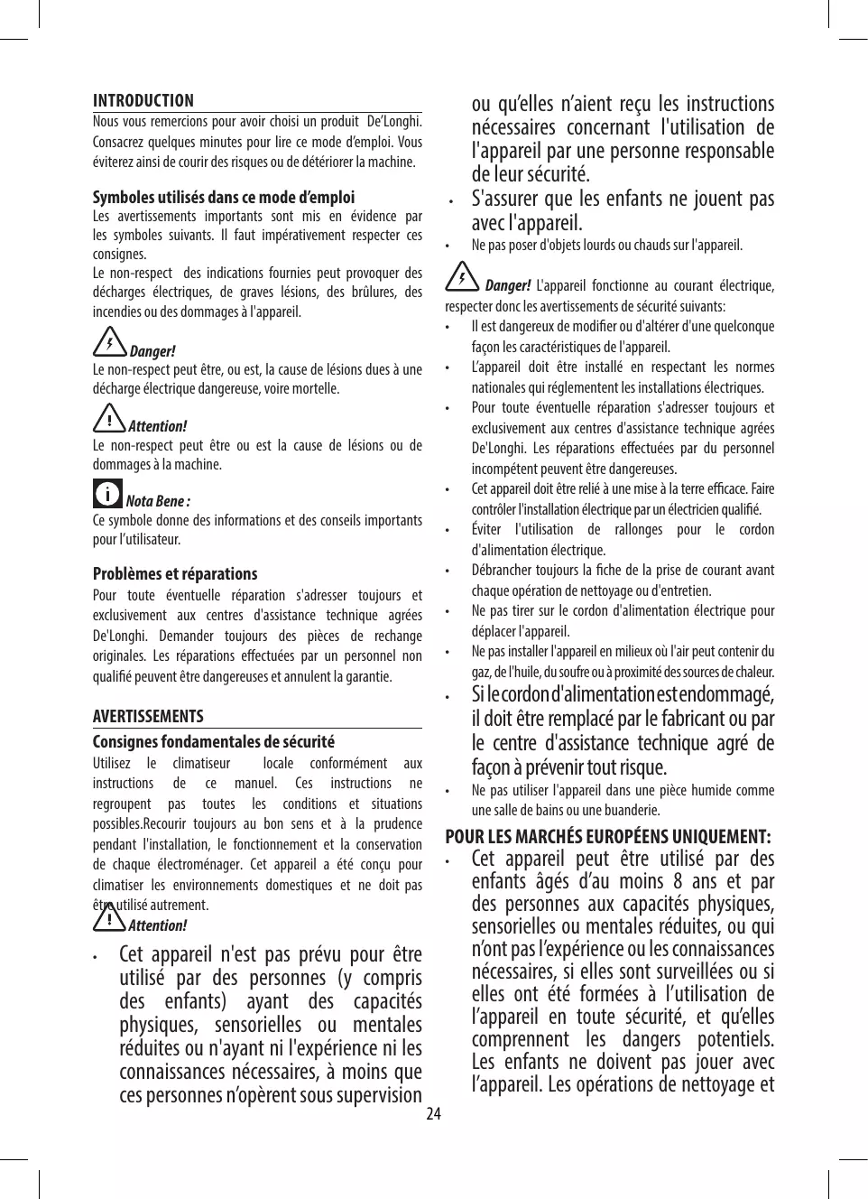 Pour toute éventuelle réparation s'adresser toujours et exclusivement aux centres d'assistance technique agrées De'Longhi. Demander toujours des pièces de rechange originales. Les réparations effectuées par un personnel non qualifié peuvent être dangereuses et annulent la garantie.