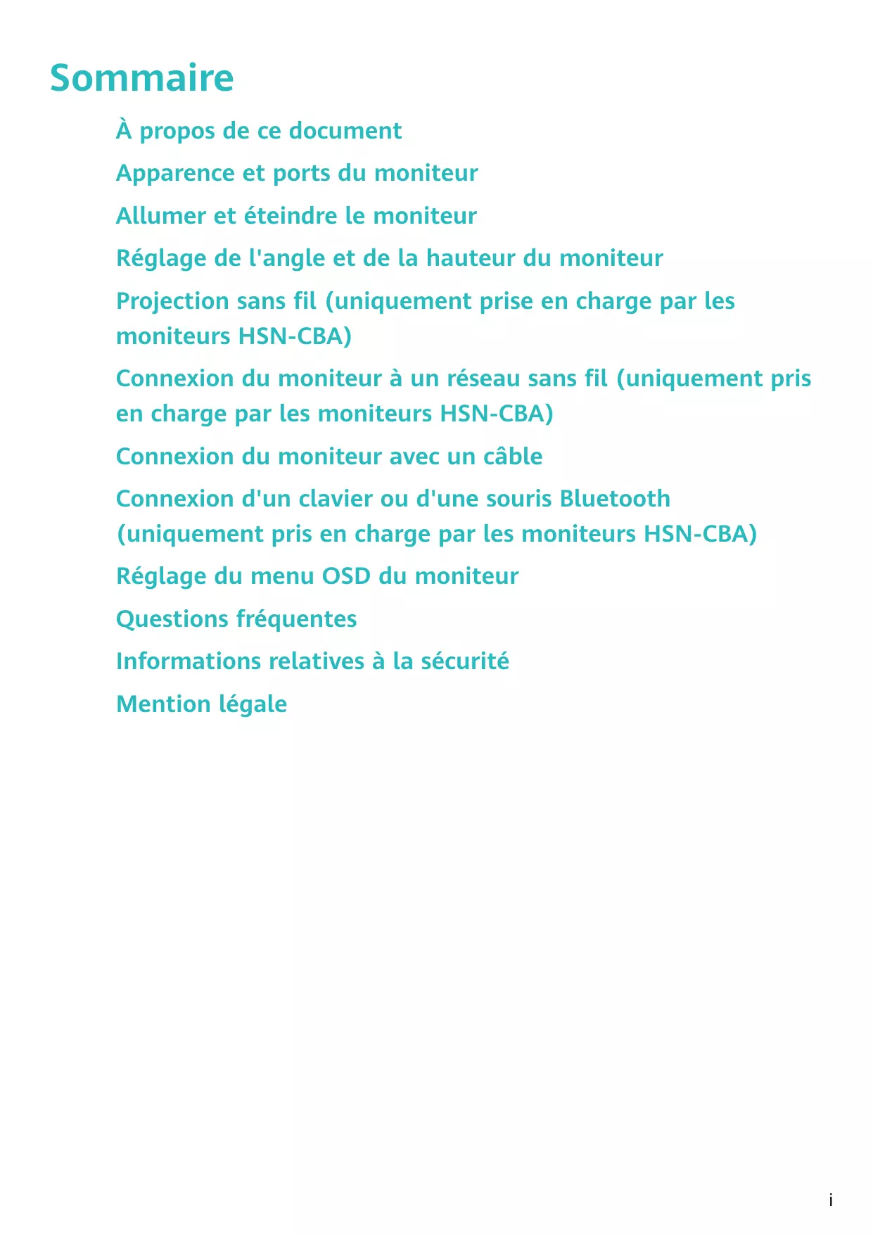 Guide d'utilisation Sommaire À propos de ce document Apparence et ports du moniteur Allumer et éteindre le moniteur Réglage de l'angle et de la hauteur du moniteur Projection sans fil (uniquement prise en charge par les moniteurs HSN-CBA) Connexion du moniteur à un réseau sans fil (uniquement pris en charge par les moniteurs HSN-CBA) Connexion du moniteur avec un câble Connexion d'un clavier ou d'une souris Bluetooth (uniquement pris en charge par les moniteurs HSN-CBA) Réglage du menu OSD du moniteur Questions fréquentes Informations relatives à la sécurité Mention légale