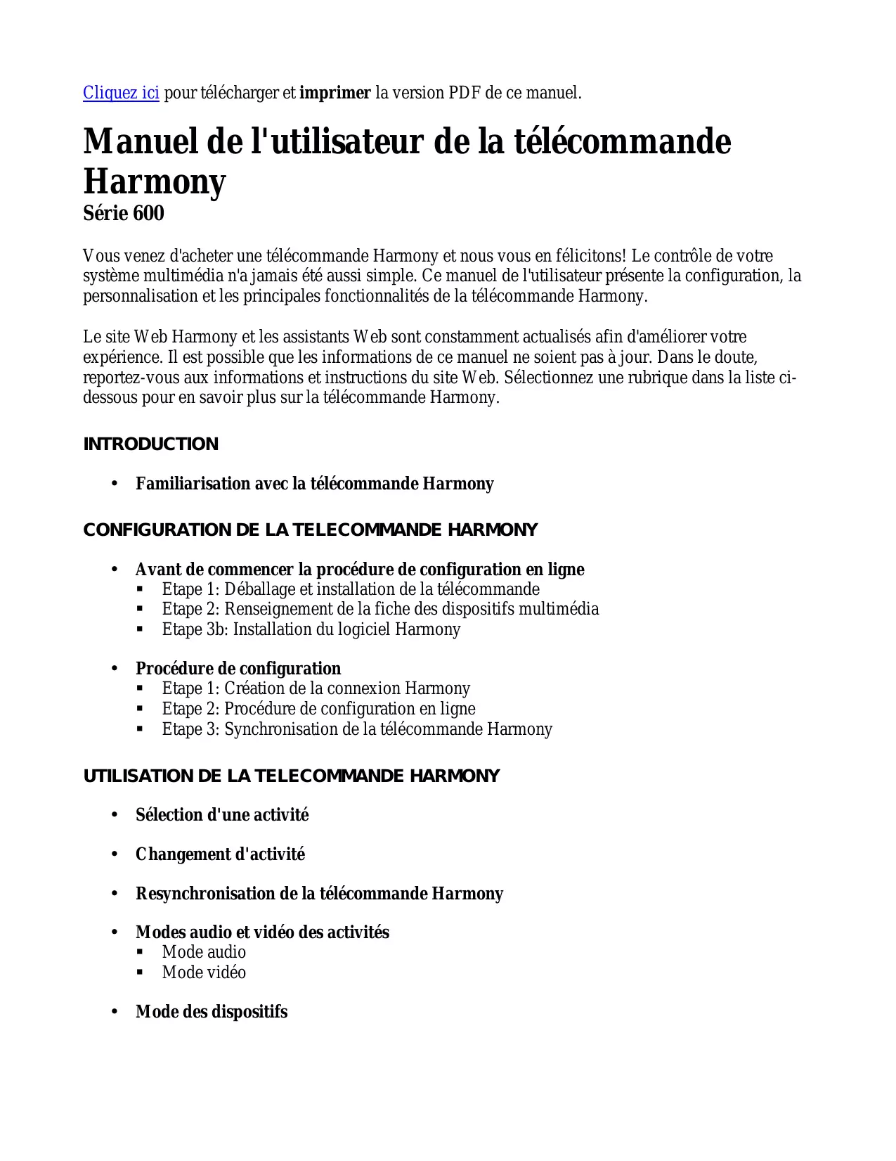 Cliquez ici pour télécharger et imprimer la version PDF de ce manuel. Manuel de l'utilisateur de la télécommande Harmony Série 600 Vous venez d'acheter une télécommande Harmony et nous vous en félicitons! Le contrôle de votre système multimédia n'a jamais été aussi simple. Ce manuel de l'utilisateur présente la configuration, la personnalisation et les principales fonctionnalités de la télécommande Harmony. Le site Web Harmony et les assistants Web sont constamment actualisés afin d'améliorer votre expérience. Il est possible que les informations de ce manuel ne soient pas à jour. Dans le doute, reportez-vous aux informations et instructions du site Web. Sélectionnez une rubrique dans la liste cidessous pour en savoir plus sur la télécommande Harmony. INTRODUCTION