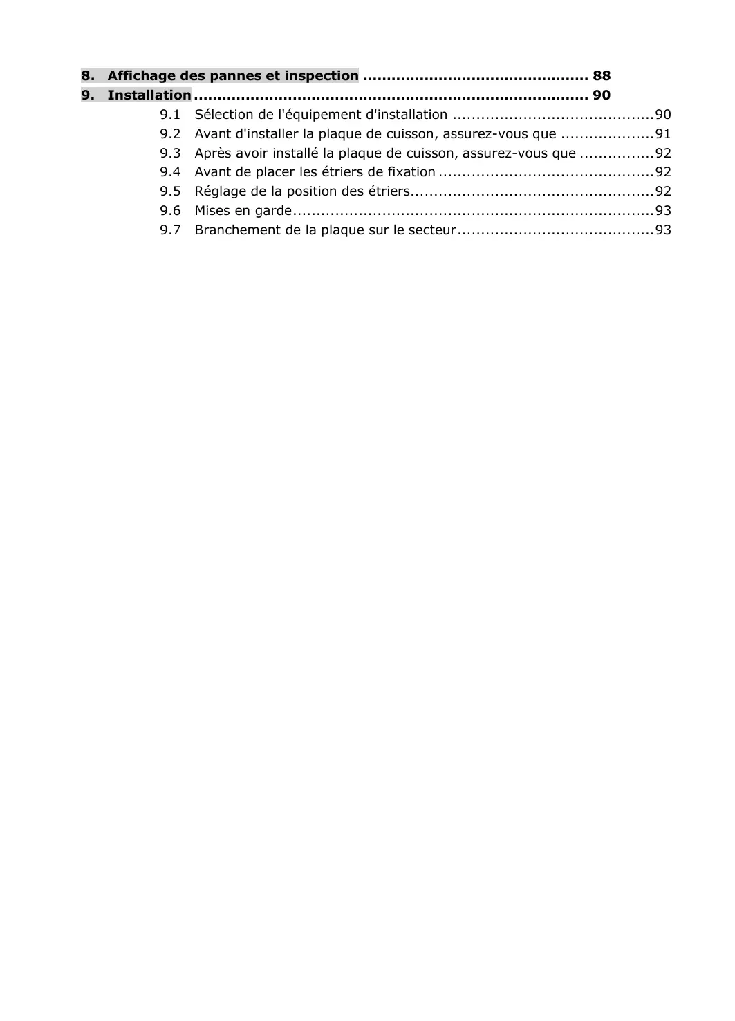 9. Installation 90 9.1 Sélection de l'équipement d'installation 90 9.2 Avant d'installer la plaque de cuisson, assurez-vous que 91 9.3 Après avoir installé la plaque de cuisson, assurez-vous que 92 9.4 Avant de placer les étriers de fixation 92 9.5 Réglage de la position des étriers 92 9.6 9.7