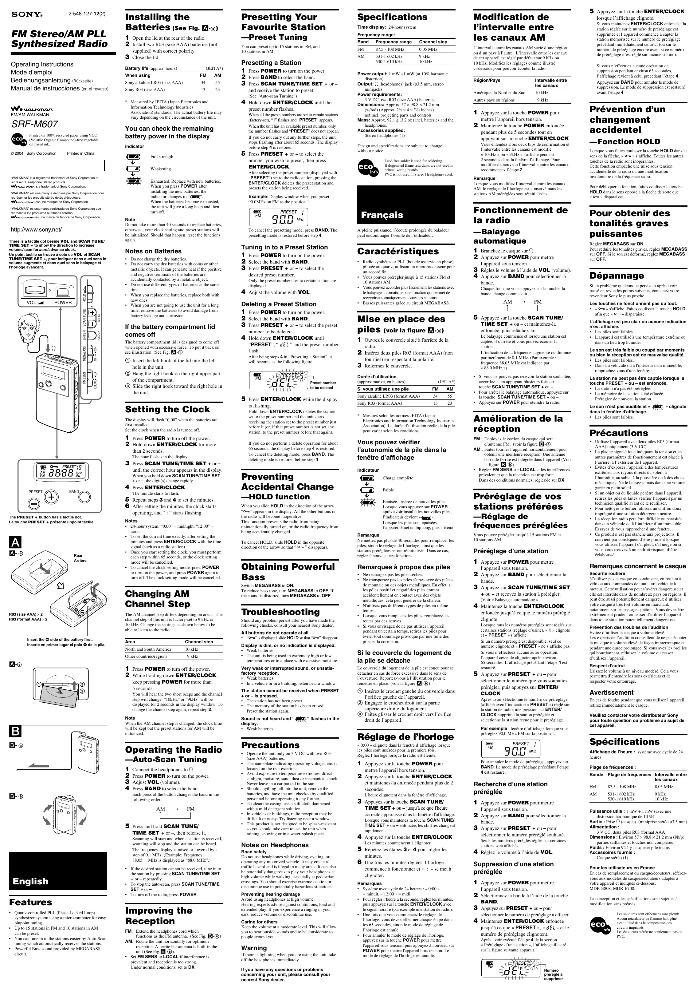 Précautions • Utilisez l’appareil avec deux piles R03 (format AAA) uniquement (3 V CC). • La plaque signalétique indiquant la tension et les autres paramètres de fonctionnement est placée à l’arrière, à l’extérieur de l’appareil. • Evitez d’exposer l’appareil à des températures extrêmes, aux rayons directs du soleil, à l’humidité, au sable, à la poussière ou à des chocs mécaniques. Ne le laissez jamais dans une voiture garée en plein soleil. • Si un objet ou du liquide pénètre dans l’appareil, retirez les piles et faites vérifier l’appareil par un technicien qualifié avant de le réutiliser. • Pour nettoyer le boîtier, utilisez un chiffon doux imprégné d’une solution détergente neutre. • La réception radio peut être difficile ou parasitée dans un véhicule ou à l’intérieur d’un immeuble. Essayez de vous rapprocher d’une fenêtre. • Ce produit n’est pas étanche aux projections. Il convient par conséquent d’être prudent lorsque vous utilisez l’appareil s’il pleut, s’il neige ou si vous vous trouvez à un endroit risquant d’être éclaboussé.