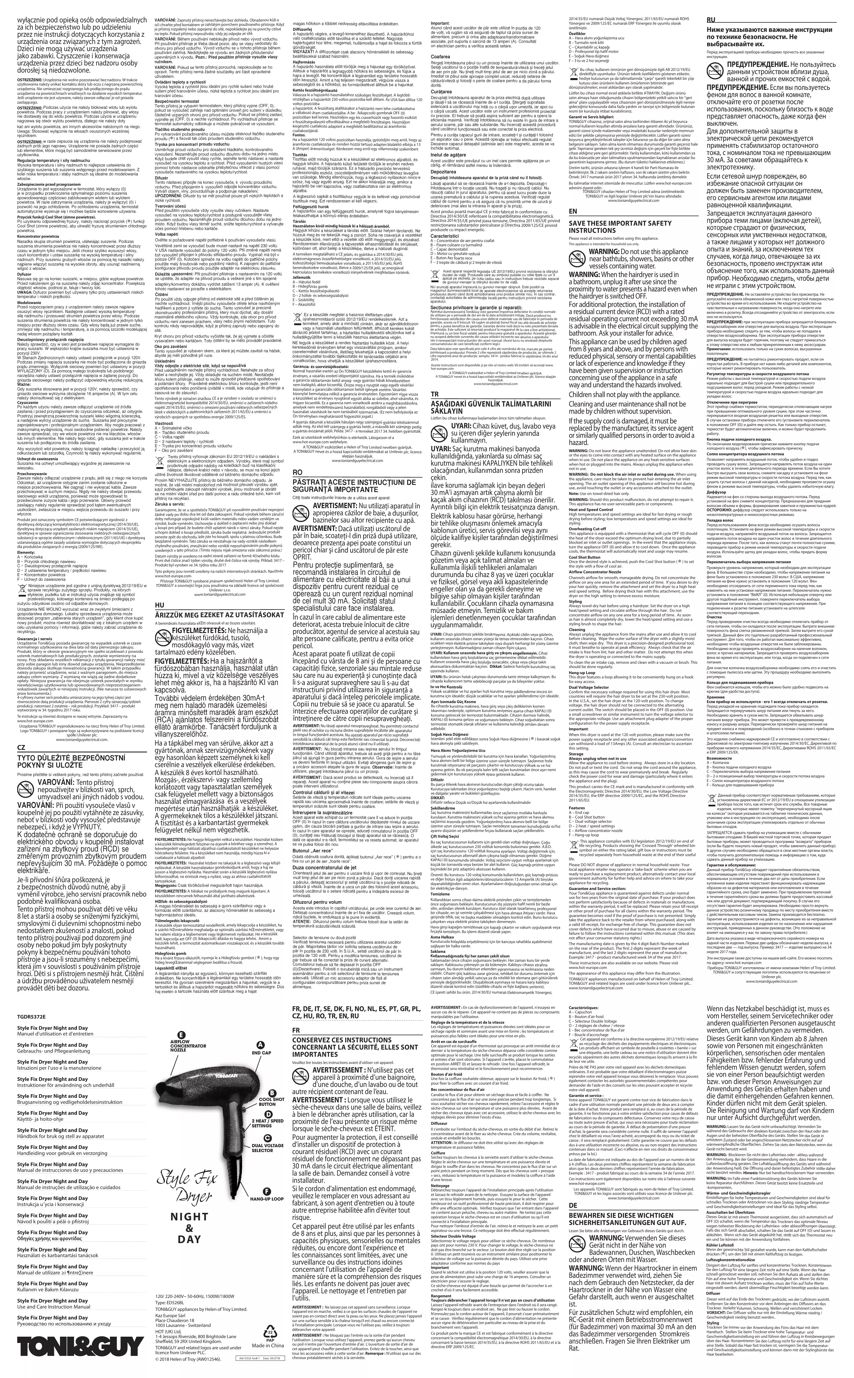 l’utilisation. Lorsque vous utilisez l’appareil, prenez garde qu’aucun cheveu ou poil n’entre par l’ouverture d’entrée d’air. L’ouverture de sortie d’air de cet appareil peut chauffer pendant l’utilisation. Evitez de la toucher, ainsi que tous les accessoires reliés à cette sortie d’air. Remarque : N’utilisez que sur des cheveux préalablement séchés à la serviette. Important: Atunci c<nd acest usc™tor de p™r este utilizat ¶n pozi^ia de 120 de vol^i, v™ rug™m s™ v™ asigura^i de faptul c™ priza sursei de alimentare, precum `i orice alte adaptoare/transformatoare asociate, pot suporta o sarcin™ de 13 amperi (A). Consulta^i un electrician pentru a verifica aceast™ setare. Coafarea fiterge∑i ¶ntotdeauna p™rul cu un prosop ¶nainte de utilizarea unui usc™tor. Seta∑i usc™torul la o pozi∑ie ¶nalt™ de temperatur™/vitez™ ≥i trece∑i jetul de aer prin p™r. Nu ∑ine∑i mult timp jetul de aer pe nicio zon™ a p™rului. Imediat ce p™rul este aproape complet uscat, reduce∑i setarea de c™ldur™/vitez™ ≥i folosi∑i o perie de coafare pentru a da p™rului forma dorit™. Cur™∑area Decupla∑i ¶ntotdeauna aparatul de la priza electric™ dup™ utilizare ≥i l™sa∑i-l s™ se r™ceasc™ ¶nainte de a-l cur™∑a. ≤terge∑i suprafa™a exterioar™ a usc™torului mai ¶nt<i cu o c<rp™ u≥or umezit™, iar apoi cu o c<rp™ uscat™. Acest usc™tor este un instrument profesionist proiectat cu precizie. El trebuie s™ poat™ aspira suficient aer pentru a opera la eficien™a maxim™. Verifica∑i ¶ntotdeauna s™ nu existe ¶n gura de intrare a aerului scame, p™r sau alte substan™e. Nu ¶ncerca∑i aceast™ procedur™ c<nd usc™torul func∑ioneaz™ sau este conectat la priza electric™. Pentru a cur™∑a capacul gurii de intrare, scoate∑i-l ≥i cur™∑a∑i-l folosind un aspirator sau o perie. Aceast™ opera∑ie ar trebui efectuat™ regulat. Deoarece capacul deta`abil (admisie aer) este magnetic, acesta se va ¶nchide automat. Inelul de ag™∑are Acest usc™tor este prev™zut cu un inel care permite ag™∑area pe un c<rlig, el r™m<n<nd astfel mereu la ¶ndem<n™. Depozitarea Decupla∑i ¶ntotdeauna aparatul de la priz™ c<nd nu ¶l folosi∑i. L™sa∑i aparatul s™ se r™ceasc™ ¶nainte de a-l depozita. Depozita∑i-l ¶ntotdeauna ¶ntr-o loca∑ie uscat™. Nu trage∑i ≥i nu r™suci∑i cablul. Nu r™suci∑i cablul ¶n jurul aparatului, pentru c™ acest lucru poate duce la uzarea prematur™ a cablului ≥i la ruperea acestuia. Verifica∑i regulat cablul de curent pentru a v™ asigura c™ nu prezint™ urme de uzur™ ≥i deteriorare (mai ales la intrarea ¶n aparat ≥i la priz™). Acest produs poartă marcajul CE şi este fabricat în conformitate cu Directiva 2014/30/UE referitoare la compatibilitatea electromagnetică, Directiva 2014/35/UE privind joasa tensiune, Directiva 2011/65/UE privind restricţionarea substanţelor periculoase şi Directiva 2009/125/CE privind produsele cu impact energetic. Caracteristici A – Concentrator de aer pentru coafat B – Fixare culoare cu turmalină C – Capac demontabil D – Motor cu greutate redusă E – Buton Aer foarte rece F – 3 trepte de căldură şi 2 trepte de viteză Acest aparat respect™ legisla∑ia UE 2012/19/EU privind reciclarea la sf<r≥itul duratei de via∑™. Produsele care au simbolul pubelei cu rotile t∑iate cu un X aplicat pe etichet™, pe cutia cadou sau ¶n instruc∑iuni trebuie reciclate separat de gunoiul menajer la sf<r≥itul duratei lor de via∑™. NU arunca∑i aparatul ¶mpreun™ cu gunoiul menajer obi≥nuit. Este posibil ca magazinul dumneavoastr™ local de aparate electrocasnice s™ accepte returnarea produsului atunci c<nd dori∑i achizi∑ionarea unui produs similar nou. •n caz contrar, contacta∑i autoritatea de administra∑ie local™ pentru instruc∑iuni privind reciclarea aparatului. Sec^iunea privitoare la garan^ie ≥i repara^ii: Aparatul dumneavoastră Toni&Guy este garantat împotriva defectelor în condiţii normale de utilizare pe o perioadă de doi ani de la data achiziţionării iniţiale. Dacă produsul nu funcţionează satisfăcător din cauza unor defecte materiale sau de fabricaţie în perioada de garanţie, acesta va fi înlocuit. Vă rugăm să păstraţi bonul fiscal sau altă dovadă de achiziţie pentru a putea beneficia de garanţie. Garanţia devine nulă dacă nu este prezentată dovada de achiziţie. Este suficient să returnaţi produsul la magazinul de la care a fost achiziţionat, împreună cu un bon fiscal valabil, pentru înlocuirea gratuită a aparatului. Această garanţie nu acoperă defectele survenite din cauza utilizării incorecte sau abuzive a aparatului sau a nerespectării instrucţiunilor din acest manual. (Acest lucru nu anulează drepturile consumatorului de care beneficiaţi conform legii.) Data fabricaţiei este specificată prin cele 4 cifre ale numărului de lot, marcate pe partea posterioară a produsului. Primele 2 cifre reprezintă săptămâna de producţie, iar ultimele 2 cifre reprezintă anul de producţie. xemplu: 3414 - produs fabricat în săptămâna 34 din anul Aceste instrucţiuni sunt disponibile şi pe site-ul nostru web. Vă invităm să accesaţi www. hot-europe.com A TONI&GUY eszközöket a Helen of Troy Limited nevében gyártjuk. A TONI&GUY nevet és a hozzá kapcsolódó emblémákat az Unilever plc. licence alapján használjuk. www.toniandguyelectrical.com