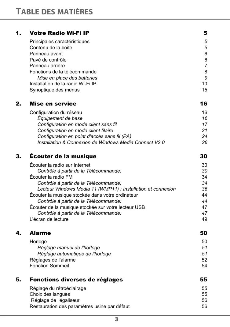 Principales caractéristiques Contenu de la boite Panneau avant Pavé de contrôle Panneau arrière Fonctions de la télécommande Mise en place des batteries Installation de la radio Wi-Fi IP Synoptique des menus