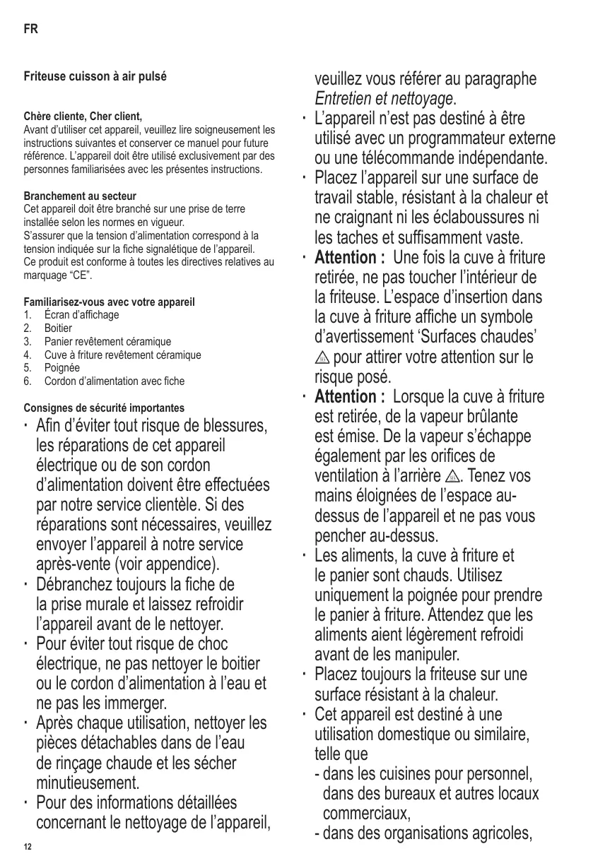 Friteuse cuisson à air pulsé Chère cliente, Cher client, Avant d’utiliser cet appareil, veuillez lire soigneusement les instructions suivantes et conserver ce manuel pour future référence. L’appareil doit être utilisé exclusivement par des personnes familiarisées avec les présentes instructions. Branchement au secteur Cet appareil doit être branché sur une prise de terre installée selon les normes en vigueur. S’assurer que la tension d’alimentation correspond à la tension indiquée sur la fiche signalétique de l’appareil. Ce produit est conforme à toutes les directives relatives au marquage “CE”. Familiarisez-vous avec votre appareil
