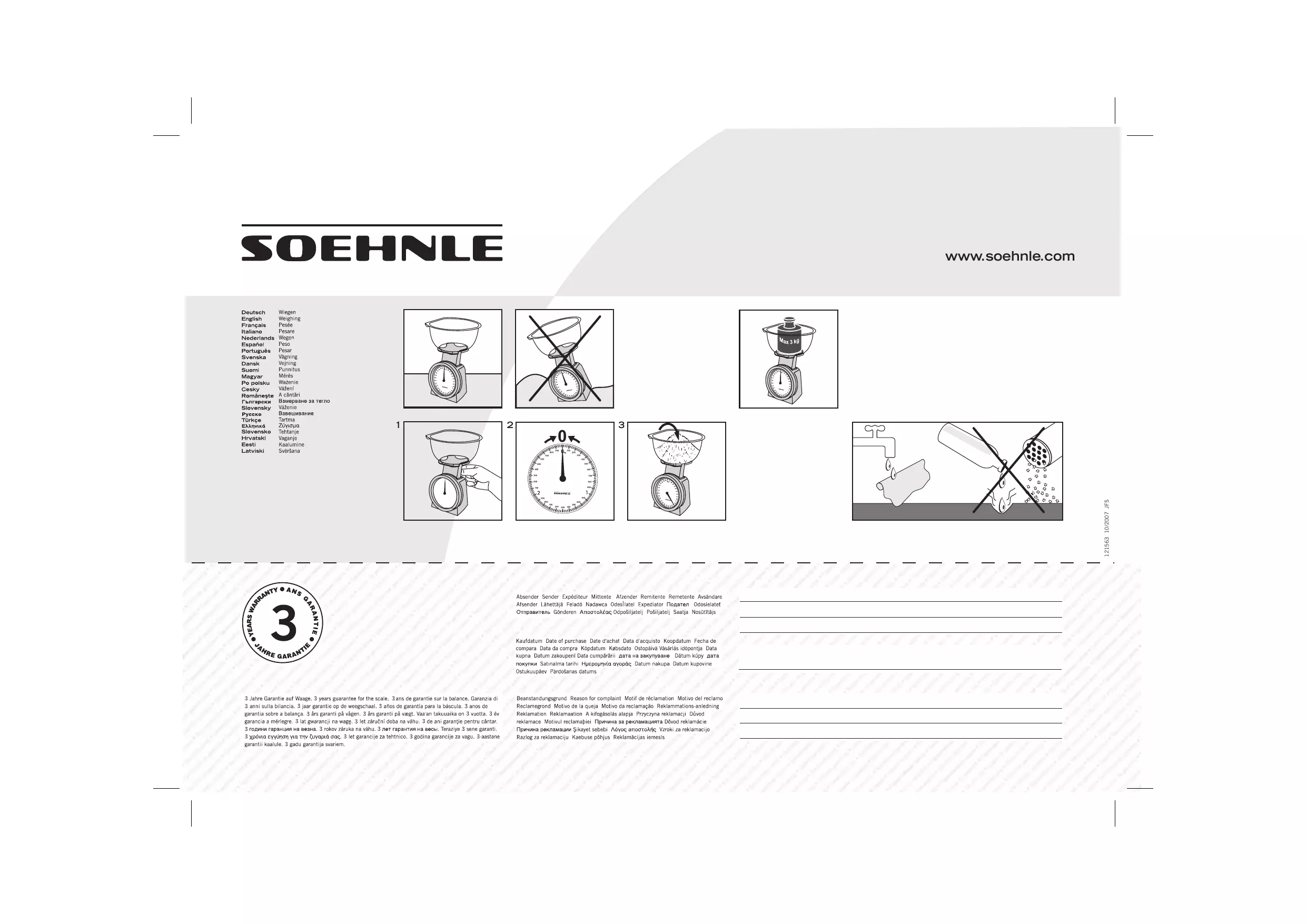 Soehnle garantit l'élimination gratuite des defaults provenant de vices de matériel ou de fabrication par réparation ou échange pour une durée de 3 ans à compter de la date d'achat. Lors de l'achat, veillez à demander à votre commerçant de remplir le bon de garantie et d'y apposer son timbre. En cas de garantie, PRIE de retourner à votre revendeur la balance avec le bon de garantie.