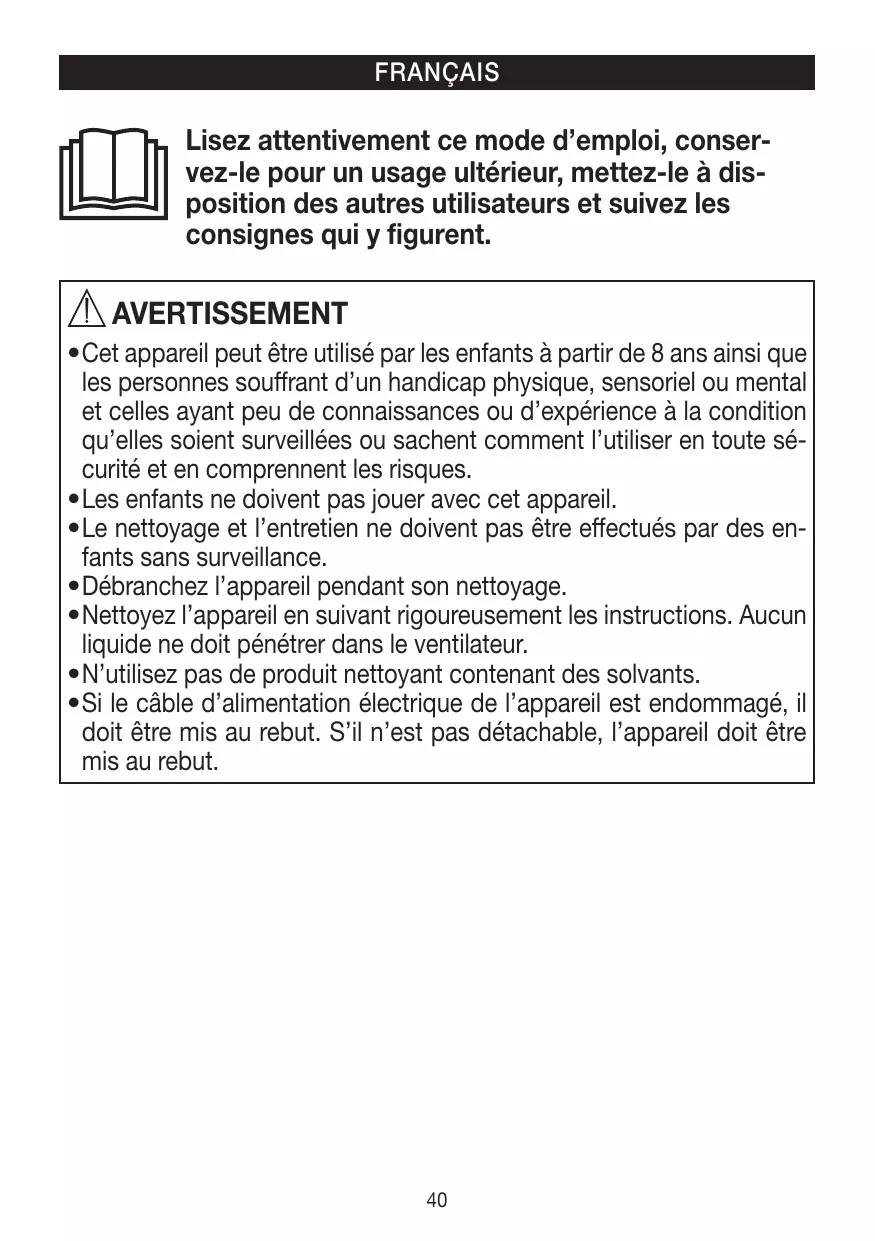 AVERTISSEMENT • Cet appareil peut être utilisé par les enfants à partir de 8 ans ainsi que les personnes souffrant d’un handicap physique, sensoriel ou mental et celles ayant peu de connaissances ou d’expérience à la condition qu’elles soient surveillées ou sachent comment l’utiliser en toute sécurité et en comprennent les risques. • Les enfants ne doivent pas jouer avec cet appareil. • Le nettoyage et l’entretien ne doivent pas être effectués par des enfants sans surveillance. • Débranchez l’appareil pendant son nettoyage. • Nettoyez l’appareil en suivant rigoureusement les instructions. Aucun liquide ne doit pénétrer dans le ventilateur. • N’utilisez pas de produit nettoyant contenant des solvants. • Si le câble d’alimentation électrique de l’appareil est endommagé, il doit être mis au rebut. S’il n’est pas détachable, l’appareil doit être mis au rebut.