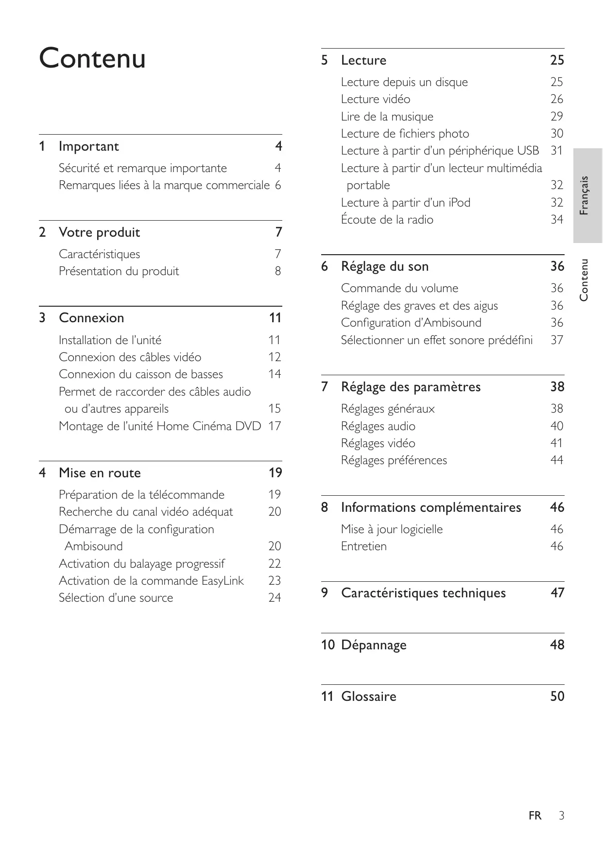 4 Mise en route Préparation de la télécommande Recherche du canal vidéo adéquat Démarrage de la conguration Ambisound Activation du balayage progressif Activation de la commande EasyLink Sélection d’une source