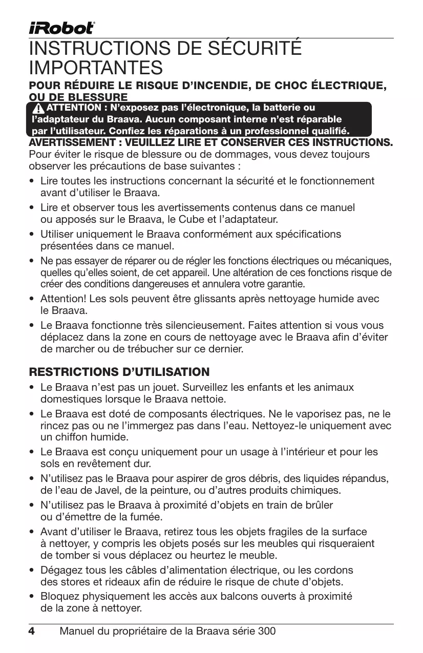 • Utiliser uniquement le Braava conformément aux spécifications présentées dans ce manuel.