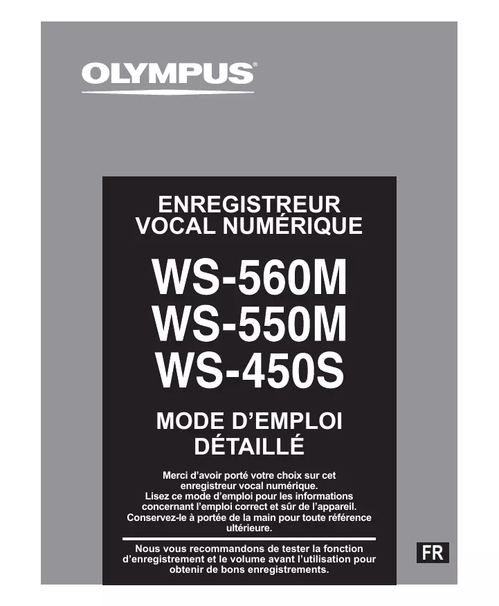 Téléchargez la notice de votre Enregistreur vocal numérique au format PDF gratuitement ! Retrouvez votre notice WS-550M - OLYMPUS et reprennez votre appareil électronique en main. Sur cette page sont publiés tous les documents nécessaires à l'utilisation de votre appareil WS-550M de la marque OLYMPUS.