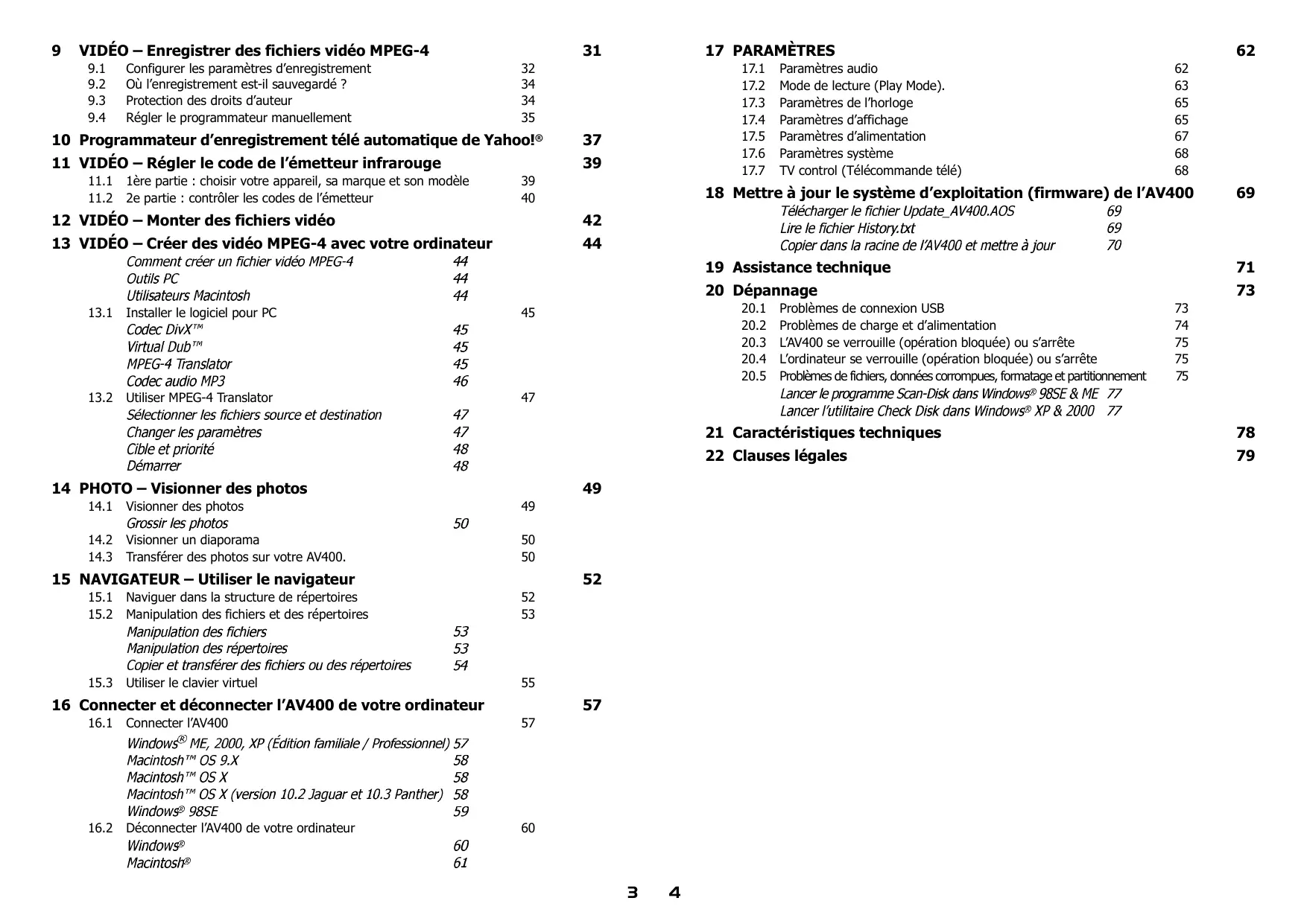 Problème : de répertoires que je n’ai jamais créés ou alors ces mêmes noms sont étrangement incompréhensibles. Réponse : (FAT) de l’AV400 soit corrompue. L’AV400 s’est peut être éteint (par manque d’énergie) pendant une phase de lecture ou d’écriture alors qu’il était connecté à l’ordinateur via USB. Pour réparer une FAT corrompue, Problème : Je souhaiterais partitionner le disque dur de l’AV400. Réponse : Si vous connaissez déjà la procédure de partitionnement, alors vous pouvez le faire. Cependant, l’AV400 ne reconnaîtra que la partition en FAT32 si bien qu’il ne verra et n’utilisera que cette partition du disque dur. que ou System volume info. Ne craignez rien, ils sont tout à fait normaux et ne risquent pas d’endommager l’AV400. Problème : Réponse Problème : différents ordinateurs. Est-ce qu’en défragmentant le disque dur de l’AV400 je risque de l’endommager ? Réponse : Défragmenter le disque dur de l’AV400 peut s’avérer utile si (Browser défragmentation avec l’utilitaire Windows® l’utilisez. également que l’AV400 est alimenté par l’intermédiaire de l’adaptateur secteur pendant la procédure.