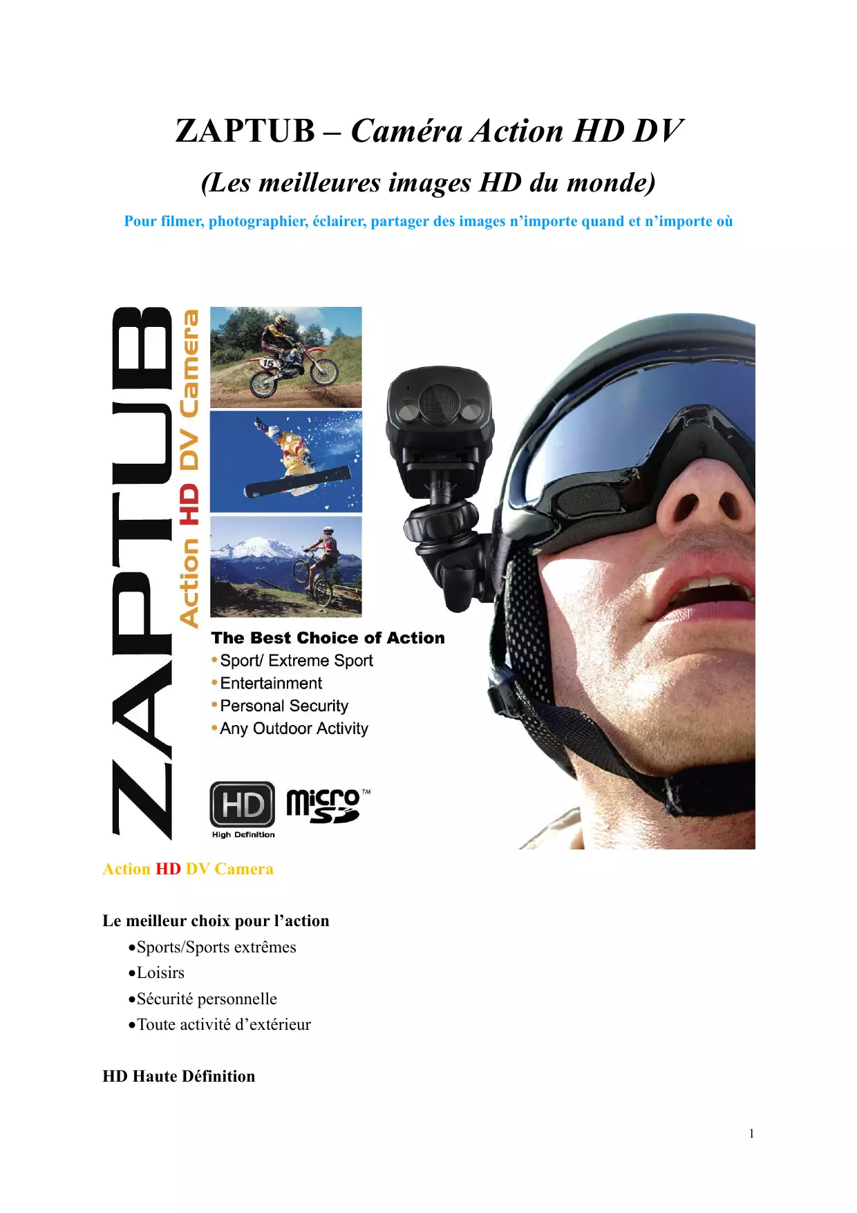ZAPTUB – Caméra Action HD DV (Les meilleures images HD du monde) Pour filmer, photographier, éclairer, partager des images n’importe quand et n’importe où Action HD DV Camera Le meilleur choix pour l’action