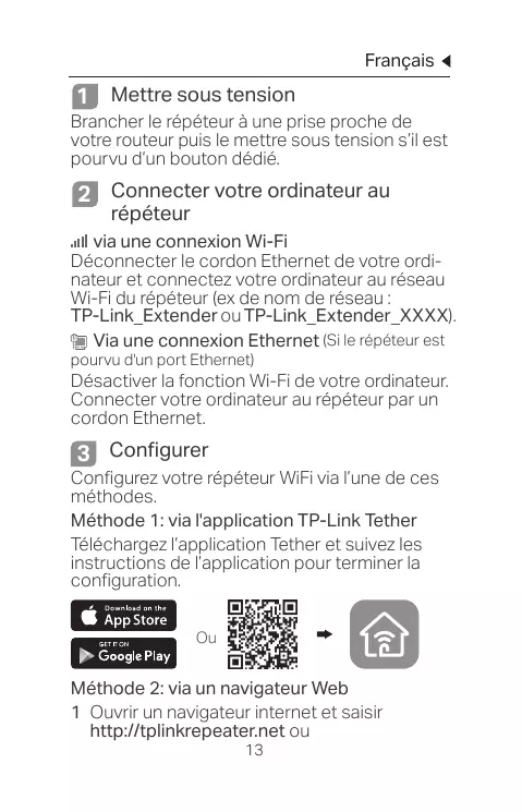 Français http://192.168.0.254 dans le champ adresse. Créez un mot de passe pour vous connecter. 2 Suivre les instructions de la page WEB pour achever la configuration initiale. 4 Positionner Pour obtenir un signal de meilleur qualité, brancher le répéteur à mi-distance entre votre routeur et la zone à couvrir. Routeur Réseau source Répéteur À mi-chemin Clients Réseau étendu Appréciez ! Connecter votre appareil au répéteur en utilisant le SSID (Nom de réseau Wi-Fi) et le mot de passe définis pendant la configuration. Le mot de passe Wi-Fi est identique à celui du réseau source émis par le routeur. Client Wi-Fi Si votre répéteur dispose d’un port Ethernet, il peut être utilisé tel un client Wi-Fi pour connecter à votre réseau Wi-Fi, tout appareil dépourvu de fonction WiFi tel un lecteur Blu-Ray, une console de jeu, une TV connectée. Connecter le répéteur au routeur puis, connecter ensuite votre appareil Ethernet au répéteur par un cordon Ethernet.