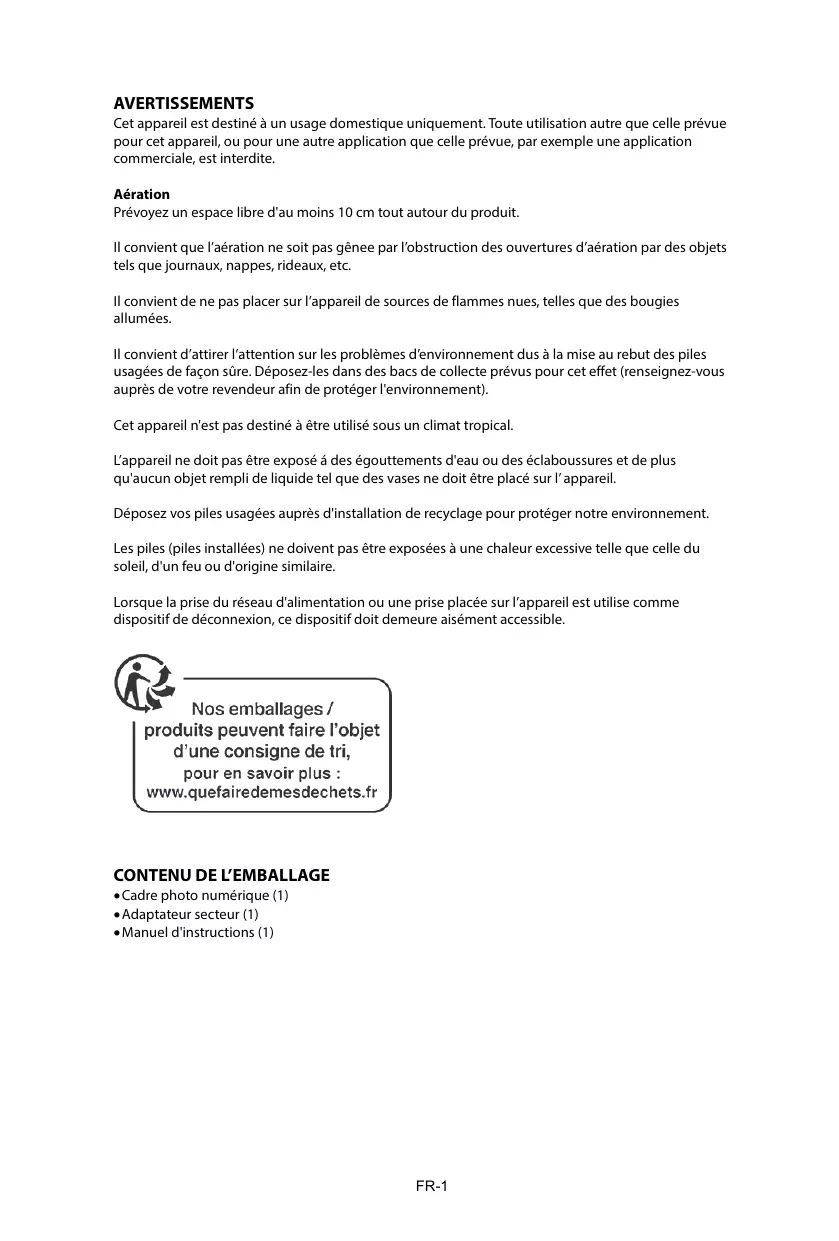 AVERTISSEMENTS Cet appareil est destiné à un usage domestique uniquement. Toute utilisation autre que celle prévue pour cet appareil, ou pour une autre application que celle prévue, par exemple une application commerciale, est interdite. Aération Prévoyez un espace libre d'au moins 10 cm tout autour du produit. Il convient que l’aération ne soit pas gênee par l’obstruction des ouvertures d’aération par des objets tels que journaux, nappes, rideaux, etc. Il convient de ne pas placer sur l’appareil de sources de flammes nues, telles que des bougies allumées. Il convient d’attirer l’attention sur les problèmes d’environnement dus à la mise au rebut des piles usagées de façon sûre. Déposez-les dans des bacs de collecte prévus pour cet effet (renseignez-vous auprès de votre revendeur afin de protéger l'environnement). Cet appareil n'est pas destiné à être utilisé sous un climat tropical. L’appareil ne doit pas être exposé á des égouttements d'eau ou des éclaboussures et de plus qu'aucun objet rempli de liquide tel que des vases ne doit être placé sur l’ appareil. Déposez vos piles usagées auprès d'installation de recyclage pour protéger notre environnement. Les piles (piles installées) ne doivent pas être exposées à une chaleur excessive telle que celle du soleil, d'un feu ou d'origine similaire. Lorsque la prise du réseau d'alimentation ou une prise placée sur l’appareil est utilise comme dispositif de déconnexion, ce dispositif doit demeure aisément accessible.