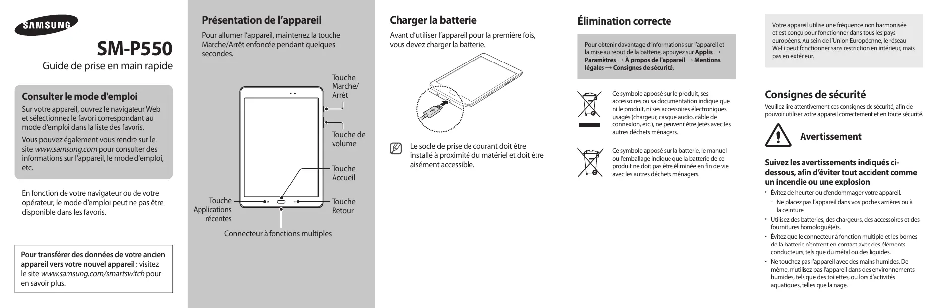 SM-P550 Présentation de l’appareil Charger la batterie Pour allumer l’appareil, maintenez la touche Marche/Arrêt enfoncée pendant quelques secondes. Avant d’utiliser l’appareil pour la première fois, vous devez charger la batterie. Guide de prise en main rapide Touche Marche/ Arrêt Consulter le mode d'emploi Sur votre appareil, ouvrez le navigateur Web et sélectionnez le favori correspondant au mode d’emploi dans la liste des favoris. Vous pouvez également vous rendre sur le site www.samsung.com pour consulter des informations sur l'appareil, le mode d'emploi, etc. En fonction de votre navigateur ou de votre opérateur, le mode d’emploi peut ne pas être disponible dans les favoris. Touche de volume Touche Accueil Touche Applications récentes Connecteur à fonctions multiples Pour transférer des données de votre ancien appareil vers votre nouvel appareil : visitez le site www.samsung.com/smartswitch pour en savoir plus. Touche Retour Élimination correcte Pour obtenir davantage d’informations sur l’appareil et la mise au rebut de la batterie, appuyez sur Applis → Paramètres → À propos de l'appareil → Mentions légales → Consignes de sécurité. Ce symbole apposé sur le produit, ses accessoires ou sa documentation indique que ni le produit, ni ses accessoires électroniques usagés (chargeur, casque audio, câble de connexion, etc.), ne peuvent être jetés avec les autres déchets ménagers. Le socle de prise de courant doit être installé à proximité du matériel et doit être aisément accessible. Ce symbole apposé sur la batterie, le manuel ou l’emballage indique que la batterie de ce produit ne doit pas être éliminée en fin de vie avec les autres déchets ménagers. Votre appareil utilise une fréquence non harmonisée et est conçu pour fonctionner dans tous les pays européens. Au sein de l’Union Européenne, le réseau Wi-Fi peut fonctionner sans restriction en intérieur, mais pas en extérieur. Consignes de sécurité Veuillez lire attentivement ces consignes de sécurité, afin de pouvoir utiliser votre appareil correctement et en toute sécurité. Avertissement Suivez les avertissements indiqués cidessous, afin d’éviter tout accident comme un incendie ou une explosion