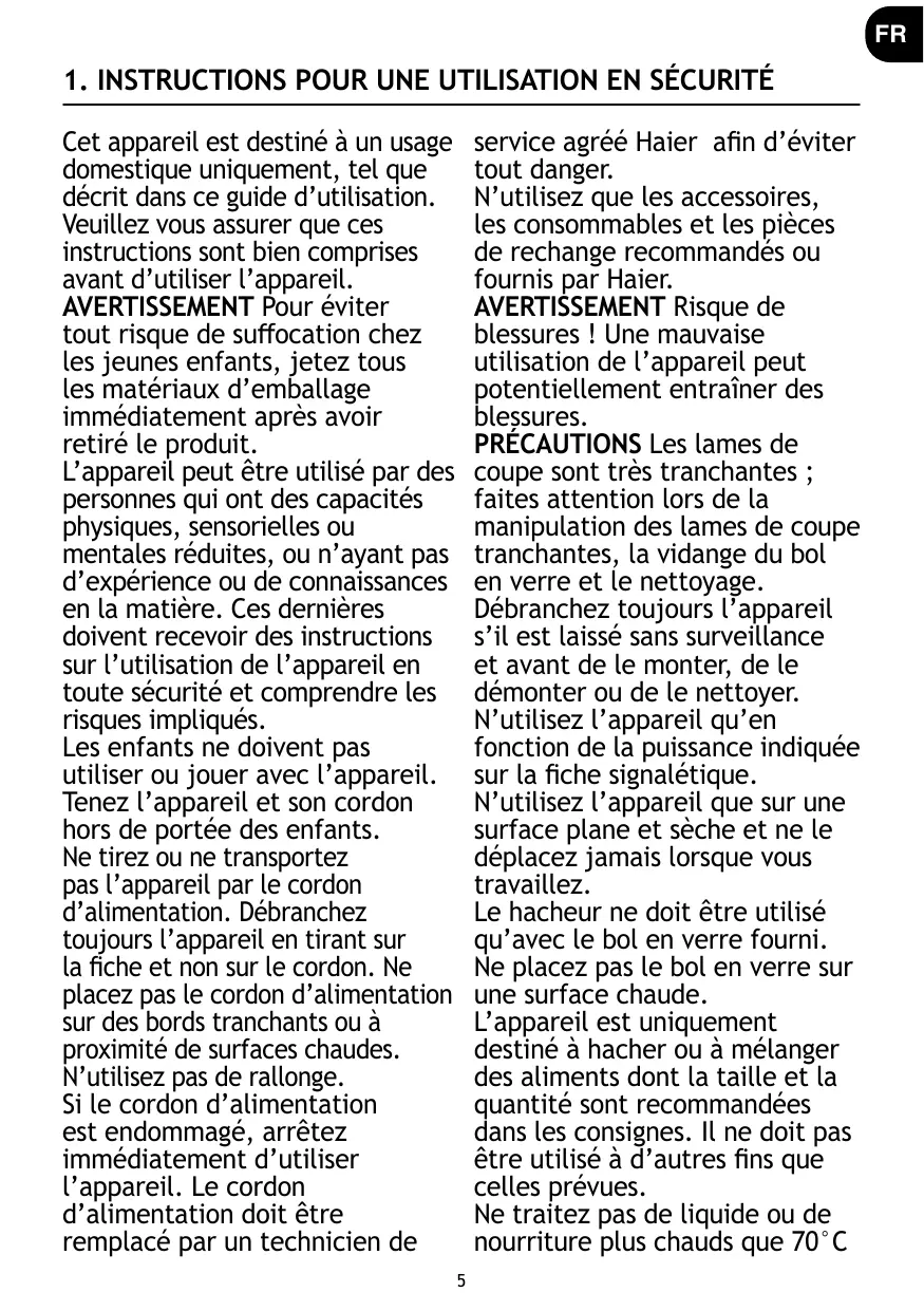 N’utilisez que les accessoires, les consommables et les pièces de rechange recommandés ou fournis par Haier. AVERTISSEMENT Risque de blessures ! Une mauvaise utilisation de l’appareil peut potentiellement entraîner des blessures. PRÉCAUTIONS Les lames de coupe sont très tranchantes ; faites attention lors de la manipulation des lames de coupe tranchantes, la vidange du bol en verre et le nettoyage. Débranchez toujours l’appareil s’il est laissé sans surveillance et avant de le monter, de le démonter ou de le nettoyer. N’utilisez l’appareil qu’en fonction de la puissance indiquée sur la fiche signalétique. N’utilisez l’appareil que sur une surface plane et sèche et ne le déplacez jamais lorsque vous travaillez. Le hacheur ne doit être utilisé qu’avec le bol en verre fourni. Ne placez pas le bol en verre sur une surface chaude. L’appareil est uniquement destiné à hacher ou à mélanger des aliments dont la taille et la quantité sont recommandées dans les consignes. Il ne doit pas être utilisé à d’autres fins que celles prévues. Ne traitez pas de liquide ou de nourriture plus chauds que 70°C 5