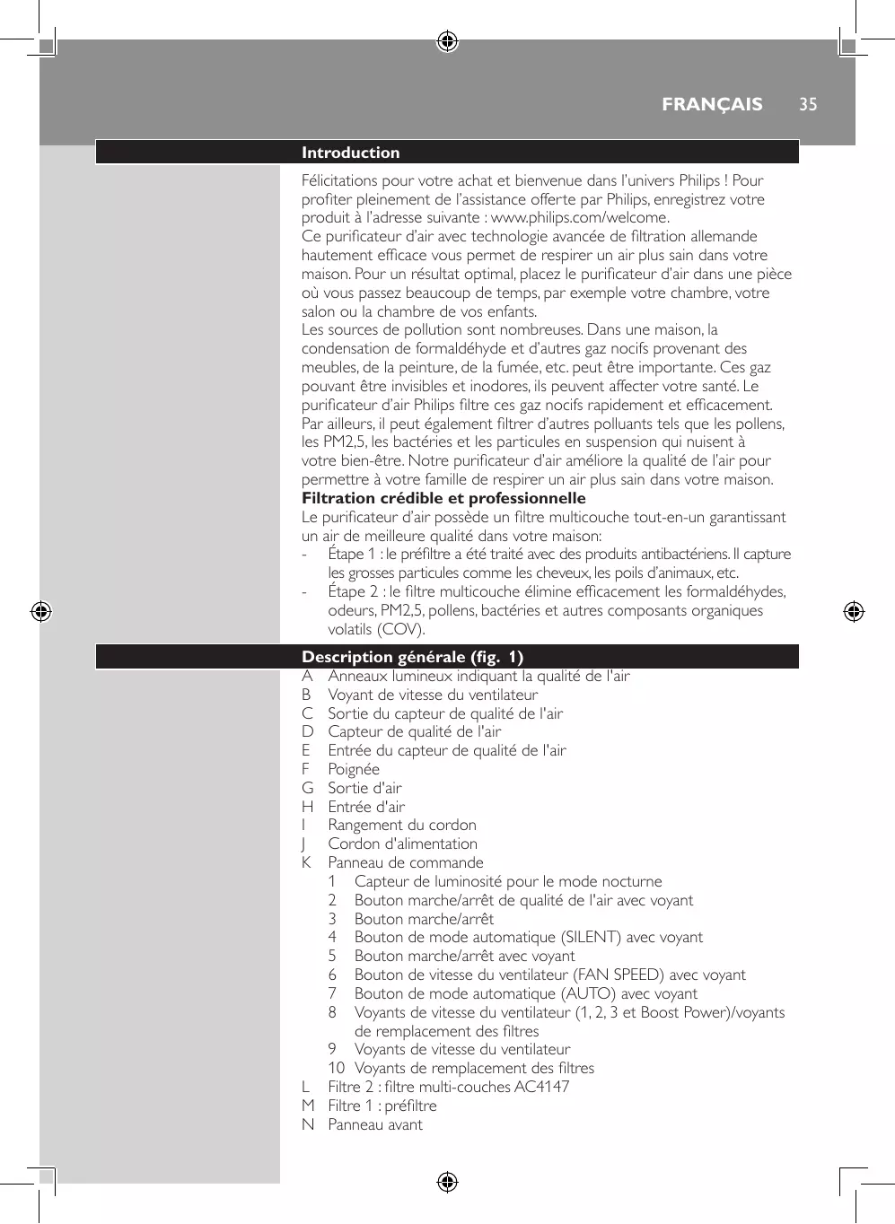Par ailleurs, il peut également filtrer d’autres polluants tels que les pollens, les PM2,5, les bactéries et les particules en suspension qui nuisent à votre bien-être. Notre purificateur d’air améliore la qualité de l’air pour permettre à votre famille de respirer un air plus sain dans votre maison. Filtration crédible et professionnelle Le purificateur d’air possède un filtre multicouche tout-en-un garantissant un air de meilleure qualité dans votre maison: -- Étape 1 : le préfiltre a été traité avec des produits antibactériens. Il capture les grosses particules comme les cheveux, les poils d’animaux, etc. -- Étape 2 : le filtre multicouche élimine efficacement les formaldéhydes, odeurs, PM2,5, pollens, bactéries et autres composants organiques volatils (COV). Description générale (fig. 1) A Anneaux lumineux indiquant la qualité de l'air B Voyant de vitesse du ventilateur C Sortie du capteur de qualité de l'air D Capteur de qualité de l'air E Entrée du capteur de qualité de l'air F Poignée G Sortie d'air H Entrée d'air I Rangement du cordon 2 Bouton marche/arrêt de qualité de l'air avec voyant 3 Bouton marche/arrêt 4 Bouton de mode automatique (SILENT) avec voyant 5 Bouton marche/arrêt avec voyant 6 Bouton de vitesse du ventilateur (FAN SPEED) avec voyant 7 Bouton de mode automatique (AUTO) avec voyant 8 Voyants de vitesse du ventilateur (1, 2, 3 et Boost Power)/voyants de remplacement des filtres 9 Voyants de vitesse du ventilateur 10 Voyants de remplacement des filtres L Filtre 2 : filtre multi-couches AC4147 M Filtre 1 : préfiltre N Panneau avant -- Si le cordon d'alimentation est endommagé, il doit être remplacé par Philips, par un Centre Service Agréé Philips ou par un technicien qualifié afin d'éviter tout accident. -- N'utilisez jamais l'appareil si la prise, le cordon d'alimentation ou l'appareil lui-même est endommagé. -- Cet appareil peut être utilisé par des enfants âgés de 8 ans ou plus, des personnes dont les capacités physiques, sensorielles ou intellectuelles sont réduites ou des personnes manquant d’expérience et de connaissances, à condition que ces enfants ou personnes soient sous surveillance ou qu’ils aient reçu des instructions quant à l’utilisation sécurisée de l’appareil et qu’ils aient pris connaissance des dangers encourus. Les enfants ne doivent pas jouer avec l’appareil. Le nettoyage et l’entretien ne doivent pas être réalisés par des enfants sans surveillance. -- Ne bloquez pas l'entrée et la sortie d'air (par exemple, en plaçant des objets sur la sortie d'air ou devant l'entrée d'air).