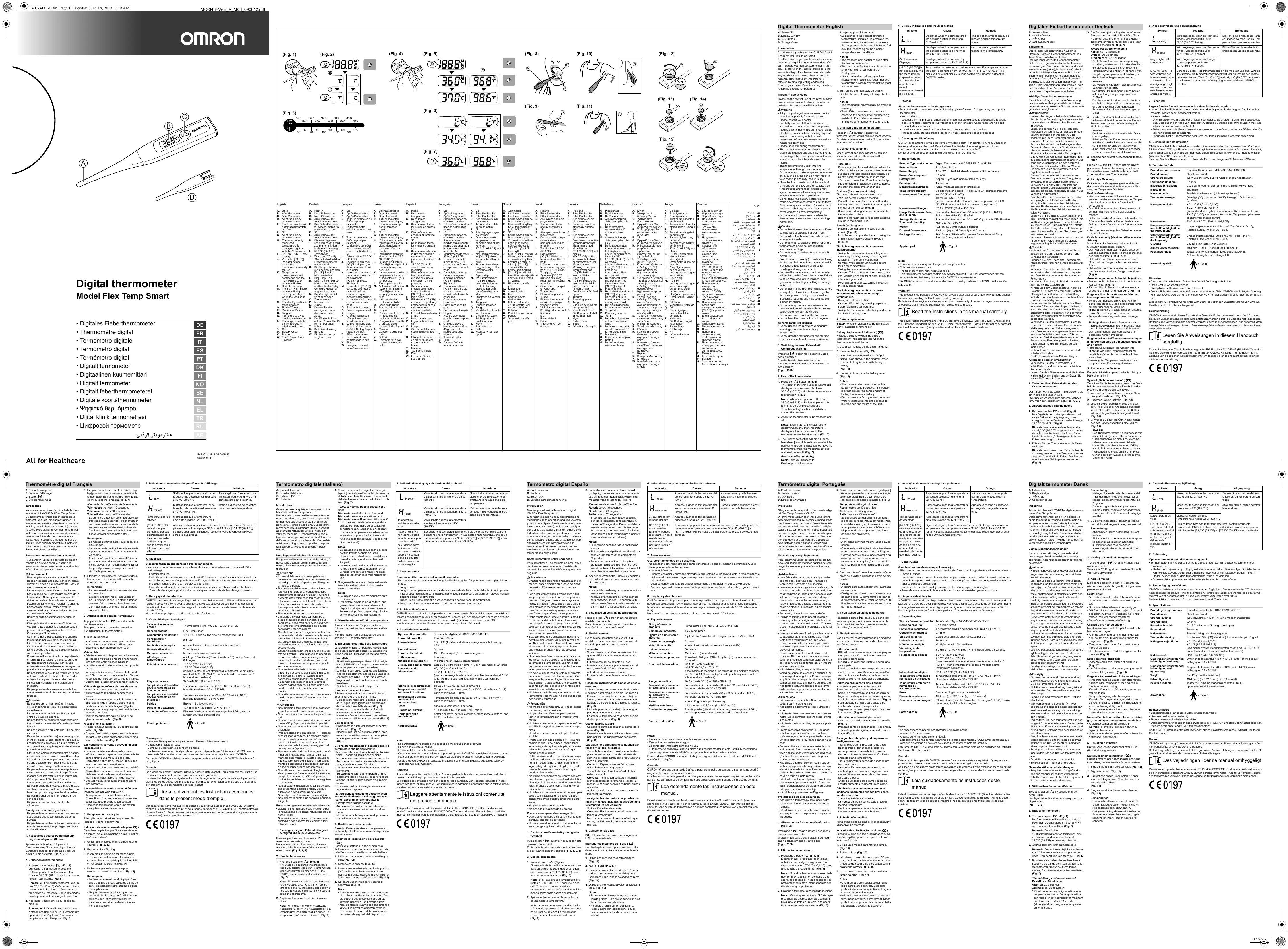 Remarques importantes sur la sécurité Pour garantir l’utilisation correcte du produit, il importe de suivre à chaque instant des mesures fondamentales de sécurité, dont les précautions indiquées ci-dessous. Avertissement • Une température élevée ou une fièvre prolongée nécessite une surveillance médicale, surtout s’il s’agit de jeunes enfants. Dans ce cas, consulter un médecin. • Lire et respecter attentivement les instructions fournies pour une lecture précise de la température. Noter que les mesures affichées dépendent de nombreux facteurs, notamment les efforts physiques, la prise de boissons chaudes ou froides avant la mesure, ainsi que de la technique de prise de mesure elle-même. • Rester parfaitement immobile pendant la mesure. • L’interprétation des mesures affichées en vue d’un auto-diagnostic est dangereuse et peut entraîner l’aggravation de votre état. Consulter plutôt un médecin. • Ce thermomètre est conçu pour prendre la température par voie orale, rectale ou axillaire. Ne pas essayer de la prendre dans d’autres endroits, comme dans l’oreille : la lecture pourrait être faussée et des blessures sont même possibles. • Conserver le thermomètre hors de portée des enfants. Ne pas laisser les enfants prendre leur température sans surveillance. Les enfants risquent de se blesser en essayant de prendre leur température sans surveillance. • Ne pas laisser la pile, le couvercle de la pile or le couvercle de la sonde à la portée des enfants. Ils risquent de les avaler. En cas d’ingestion, contacter immédiatement un médecin. • Ne pas prendre de mesure lorsque le thermomètre est mouillé : la mesure pourrait être faussée. Attention • Ne pas mordre le thermomètre. Il risque d’être endommagé et/ou l’utilisateur risque de se blesser. • Le thermomètre ne doit pas être partagé entre plusieurs personnes. • Ne pas tenter de démonter ou de réparer le thermomètre. Le résultat affiché risque d’être faussé. • Ne pas essayer de brûler la pile. Elle pourrait exploser. • Respecter la polarité (+ –) lors du remplacement de la pile. Sinon, des fuites de liquide, une génération de chaleur ou une explosion sont possibles, ce qui risquerait d’endommager le thermomètre. • Ôter la pile lorsque le thermomètre n’est pas utilisé pendant au moins 3 mois. Sinon, des fuites de liquide, une génération de chaleur ou une explosion sont possibles, ce qui risquerait d’endommager le thermomètre. • Ne pas utiliser le thermomètre en présence d’électricité statique ou de champs électromagnétiques importants. Les mesures affichées pourraient être faussées ou le thermomètre pourrait ne plus fonctionner. • Ne pas prendre de mesures par voie rectale sur des personnes souffrant de troubles rectaux, ceci pourrait aggraver l’état du patient. • Ne pas marcher sur le thermomètre ni sur son étui rigide. • Ne pas courber l’embout de plus de 45 degrés. Consignes de sécurité générales • Ne pas utiliser le thermomètre pour mesurer autre chose que la température du corps humain. • Ne pas laisser tomber le thermomètre ni son étui de rangement. Les protéger des chocs et des vibrations. 1. Passage des degrés Fahrenheit aux degrés centigrades (Celsius) Appuyer sur le bouton pendant 7 secondes jusqu’à ce qu’un bip soit émis. L’affichage change de système de mesure lorsque le bip est émis. (Fig. 1, 2, 3) 2. Utilisation du thermomètre 1. Appuyer sur le bouton . (Fig. 4) Le résultat de la mesure précédente s’affiche pendant quelques secondes. Ensuite, 37,0 °C (98,6 °F) s’affiche comme fonction test interne. (Fig. 5) Remarque : Lorsqu’une température autre que 37,0 °C (98,6 °F) s’affiche, consulter la section « 6. Indications et résolution des problèmes de l’affichage » pour obtenir des détails permettant de corriger le problème. 2. Appliquer le thermomètre sur le site de mesure. Remarque : Même si le symbole « L » ne s’affiche pas (lorsque seule la température apparaît), il ne s’agit pas d’une erreur. La température peut être prise. (Fig. 6)