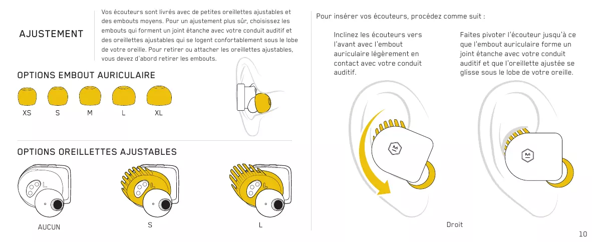 AJUSTEMENT Vos écouteurs sont livrés avec de petites oreillettes ajustables et des embouts moyens. Pour un ajustement plus sûr, choisissez les embouts qui forment un joint étanche avec votre conduit auditif et des oreillettes ajustables qui se logent confortablement sous le lobe de votre oreille. Pour retirer ou attacher les oreillettes ajustables, vous devez d'abord retirer les embouts.