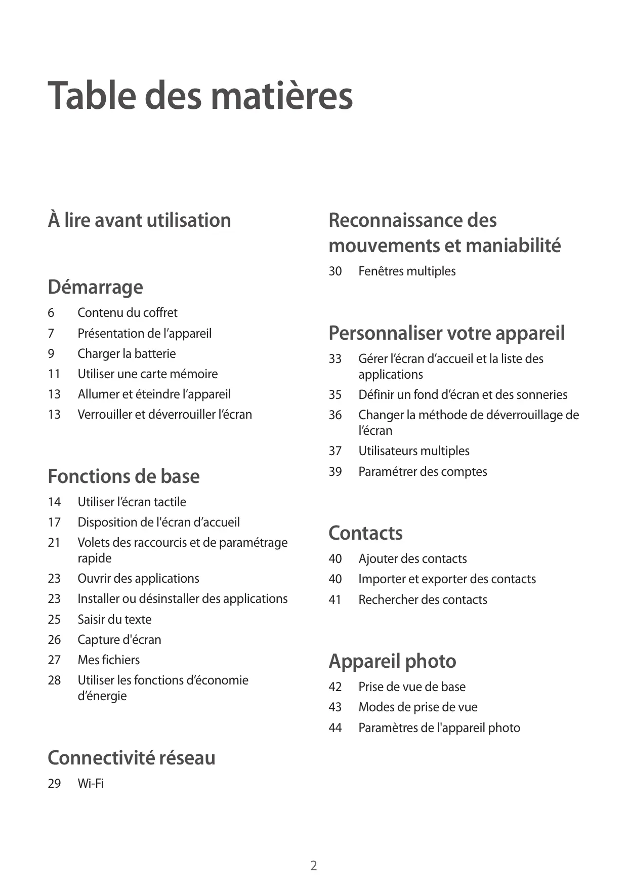 Utiliser l’écran tactile Disposition de l'écran d’accueil Volets des raccourcis et de paramétrage rapide Ouvrir des applications Installer ou désinstaller des applications Saisir du texte Capture d'écran Mes fichiers Utiliser les fonctions d’économie d’énergie Gérer l’écran d’accueil et la liste des applications Définir un fond d’écran et des sonneries Changer la méthode de déverrouillage de l’écran Utilisateurs multiples Paramétrer des comptes Contacts
