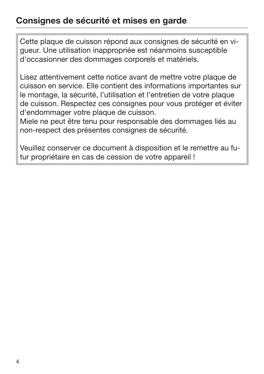 Consignes de sécurité et mises en garde Cette plaque de cuisson répond aux consignes de sécurité en vigueur. Une utilisation inappropriée est néanmoins susceptible d'occasionner des dommages corporels et matériels. Lisez attentivement cette notice avant de mettre votre plaque de cuisson en service. Elle contient des informations importantes sur le montage, la sécurité, l’utilisation et l’entretien de votre plaque de cuisson. Respectez ces consignes pour vous protéger et éviter d'endommager votre plaque de cuisson. Miele ne peut être tenu pour responsable des dommages liés au non-respect des présentes consignes de sécurité. Veuillez conserver ce document à disposition et le remettre au futur propriétaire en cas de cession de votre appareil !