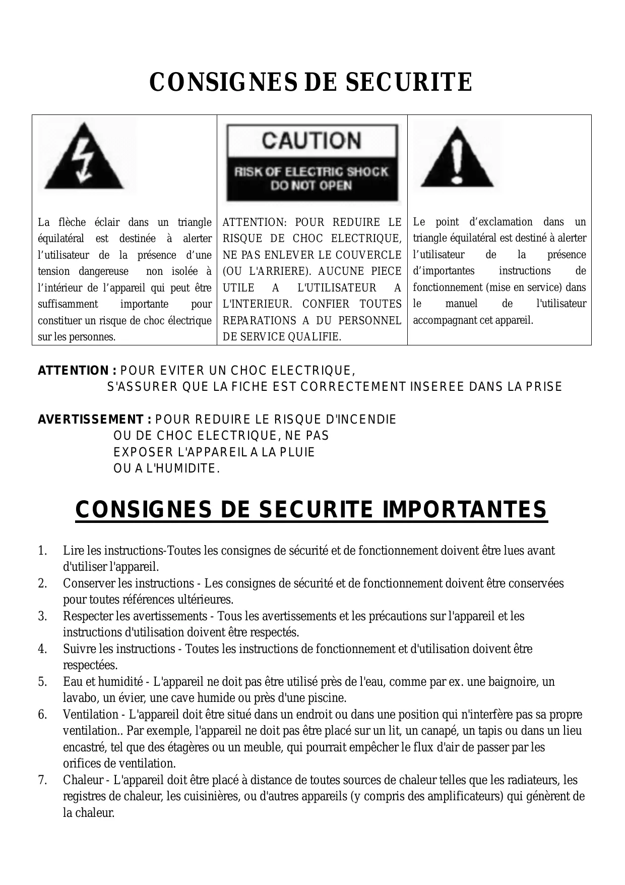 ATTENTION: POUR REDUIRE LE RISQUE DE CHOC ELECTRIQUE, NE PAS ENLEVER LE COUVERCLE (OU L'ARRIERE). AUCUNE PIECE UTILE A L'UTILISATEUR A L'INTERIEUR. CONFIER TOUTES REPARATIONS A DU PERSONNEL DE SERVICE QUALIFIE.