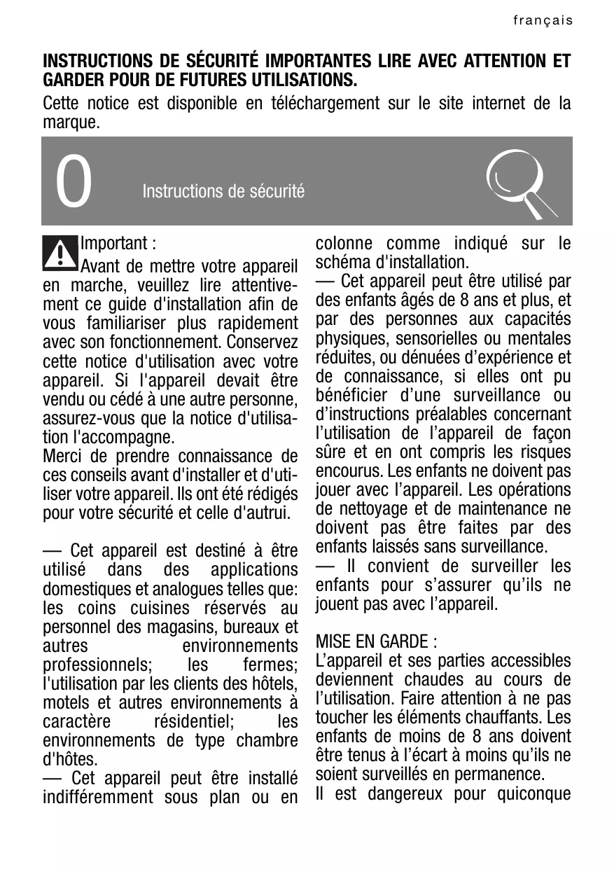 Important : Avant de mettre votre appareil en marche, veuillez lire attentivement ce guide d'installation afin de vous familiariser plus rapidement avec son fonctionnement. Conservez cette notice d'utilisation avec votre appareil. Si l'appareil devait être vendu ou cédé à une autre personne, assurez-vous que la notice d'utilisation l'accompagne. Merci de prendre connaissance de ces conseils avant d'installer et d'utiliser votre appareil. Ils ont été rédigés pour votre sécurité et celle d'autrui. — Cet appareil est destiné à être utilisé dans des applications domestiques et analogues telles que: les coins cuisines réservés au personnel des magasins, bureaux et autres environnements professionnels; les fermes; l'utilisation par les clients des hôtels, motels et autres environnements à caractère résidentiel; les environnements de type chambre d'hôtes. — Cet appareil peut être installé indifféremment sous plan ou en