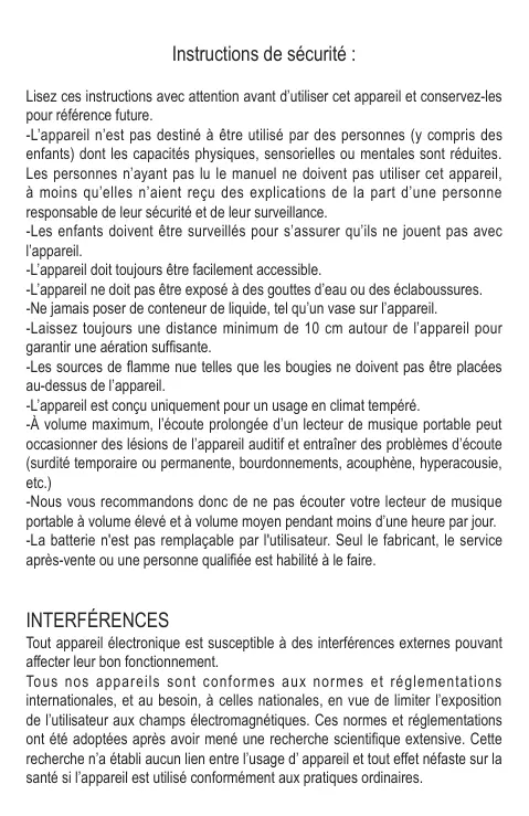 Instructions de sécurité : Lisez ces instructions avec attention avant d’utiliser cet appareil et conservez-les pour référence future. -L’appareil n’est pas destiné à être utilisé par des personnes (y compris des enfants) dont les capacités physiques, sensorielles ou mentales sont réduites. Les personnes n’ayant pas lu le manuel ne doivent pas utiliser cet appareil, à moins qu’elles n’aient reçu des explications de la part d’une personne responsable de leur sécurité et de leur surveillance. -Les enfants doivent être surveillés pour s’assurer qu’ils ne jouent pas avec l’appareil. -L’appareil doit toujours être facilement accessible. -L’appareil ne doit pas être exposé à des gouttes d’eau ou des éclaboussures. -Ne jamais poser de conteneur de liquide, tel qu’un vase sur l’appareil. -Laissez toujours une distance minimum de 10 cm autour de l’appareil pour garantir une aération suffisante. -Les sources de flamme nue telles que les bougies ne doivent pas être placées au-dessus de l’appareil. -L’appareil est conçu uniquement pour un usage en climat tempéré. -À volume maximum, l’écoute prolongée d’un lecteur de musique portable peut occasionner des lésions de l’appareil auditif et entraîner des problèmes d’écoute (surdité temporaire ou permanente, bourdonnements, acouphène, hyperacousie, etc.) -Nous vous recommandons donc de ne pas écouter votre lecteur de musique portable à volume élevé et à volume moyen pendant moins d’une heure par jour. -La batterie n'est pas remplaçable par l'utilisateur. Seul le fabricant, le service après-vente ou une personne qualifiée est habilité à le faire.