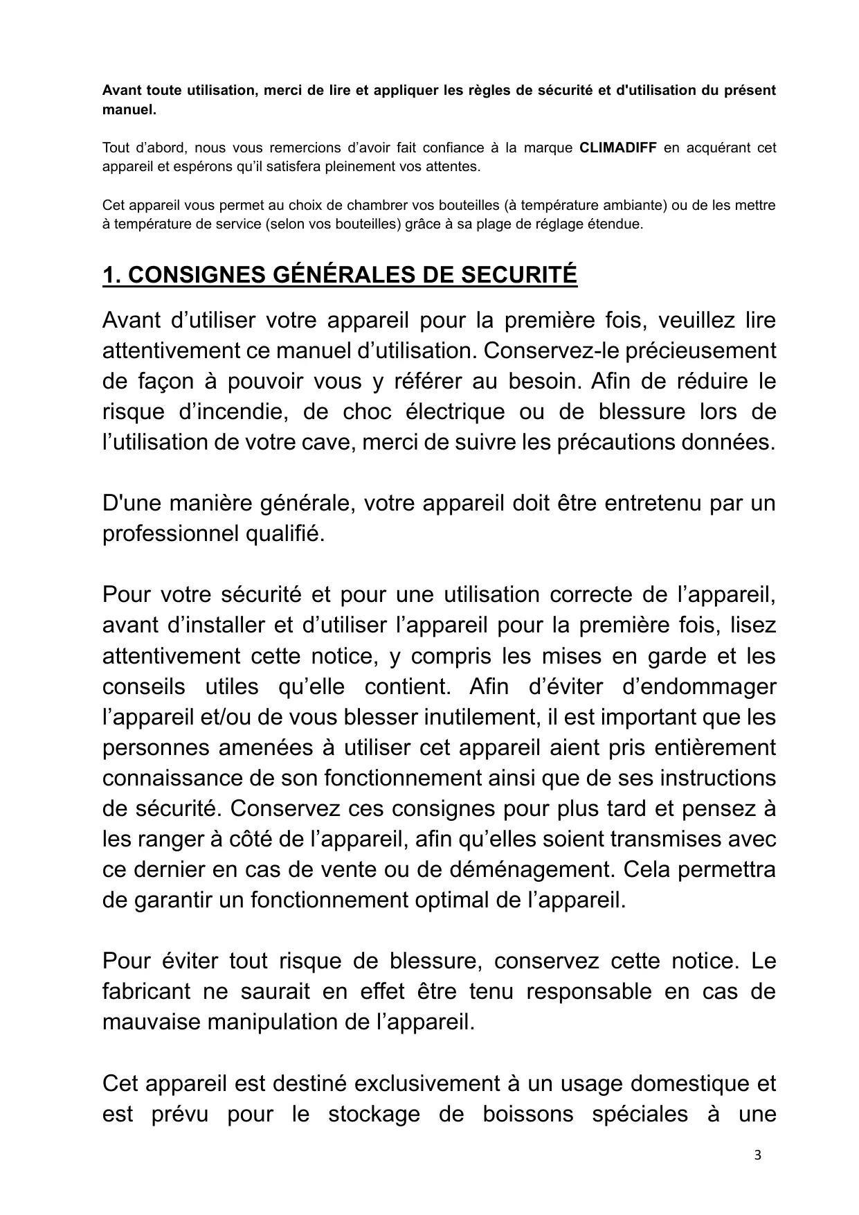 Avant d’utiliser votre appareil pour la première fois, veuillez lire attentivement ce manuel d’utilisation. Conservez-le précieusement de façon à pouvoir vous y référer au besoin. Afin de réduire le risque d’incendie, de choc électrique ou de blessure lors de l’utilisation de votre cave, merci de suivre les précautions données. D'une manière générale, votre appareil doit être entretenu par un professionnel qualifié. Pour votre sécurité et pour une utilisation correcte de l’appareil, avant d’installer et d’utiliser l’appareil pour la première fois, lisez attentivement cette notice, y compris les mises en garde et les conseils utiles qu’elle contient. Afin d’éviter d’endommager l’appareil et/ou de vous blesser inutilement, il est important que les personnes amenées à utiliser cet appareil aient pris entièrement connaissance de son fonctionnement ainsi que de ses instructions de sécurité. Conservez ces consignes pour plus tard et pensez à les ranger à côté de l’appareil, afin qu’elles soient transmises avec ce dernier en cas de vente ou de déménagement. Cela permettra de garantir un fonctionnement optimal de l’appareil. Pour éviter tout risque de blessure, conservez cette notice. Le fabricant ne saurait en effet être tenu responsable en cas de mauvaise manipulation de l’appareil. Cet appareil est destiné exclusivement à un usage domestique et est prévu pour le stockage de boissons spéciales à une 3